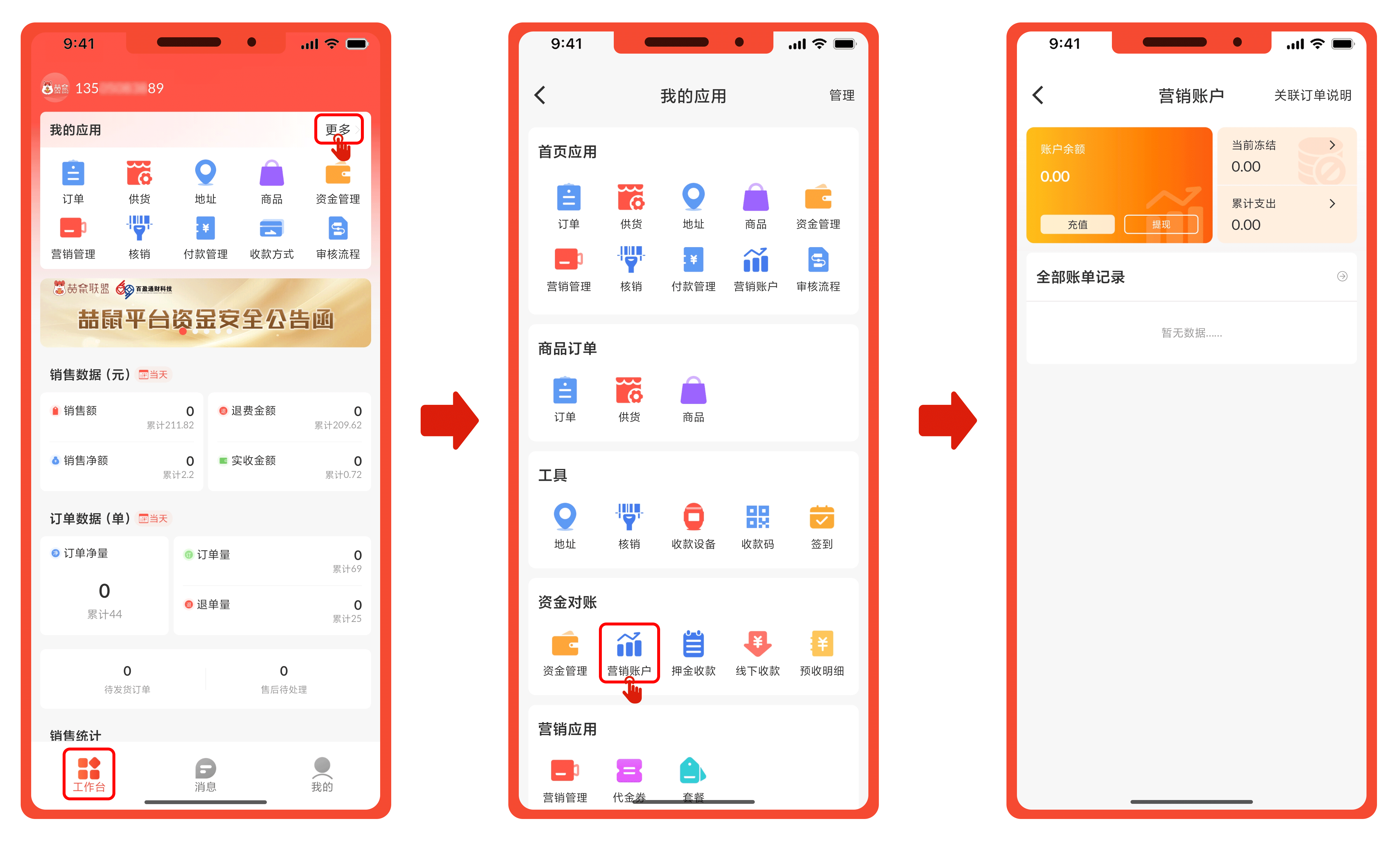 底部点击工作台,右上角点击“更多”进入我的应用。下滑找到资金对账处,点击“营销账户”进入。