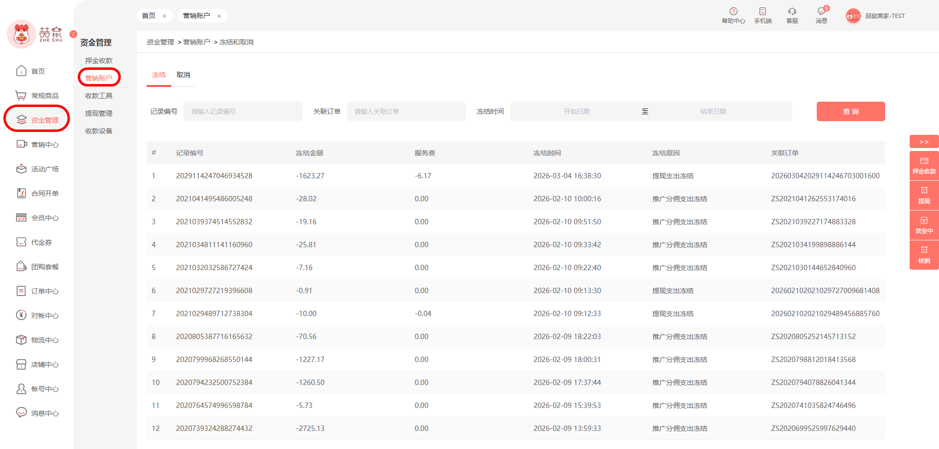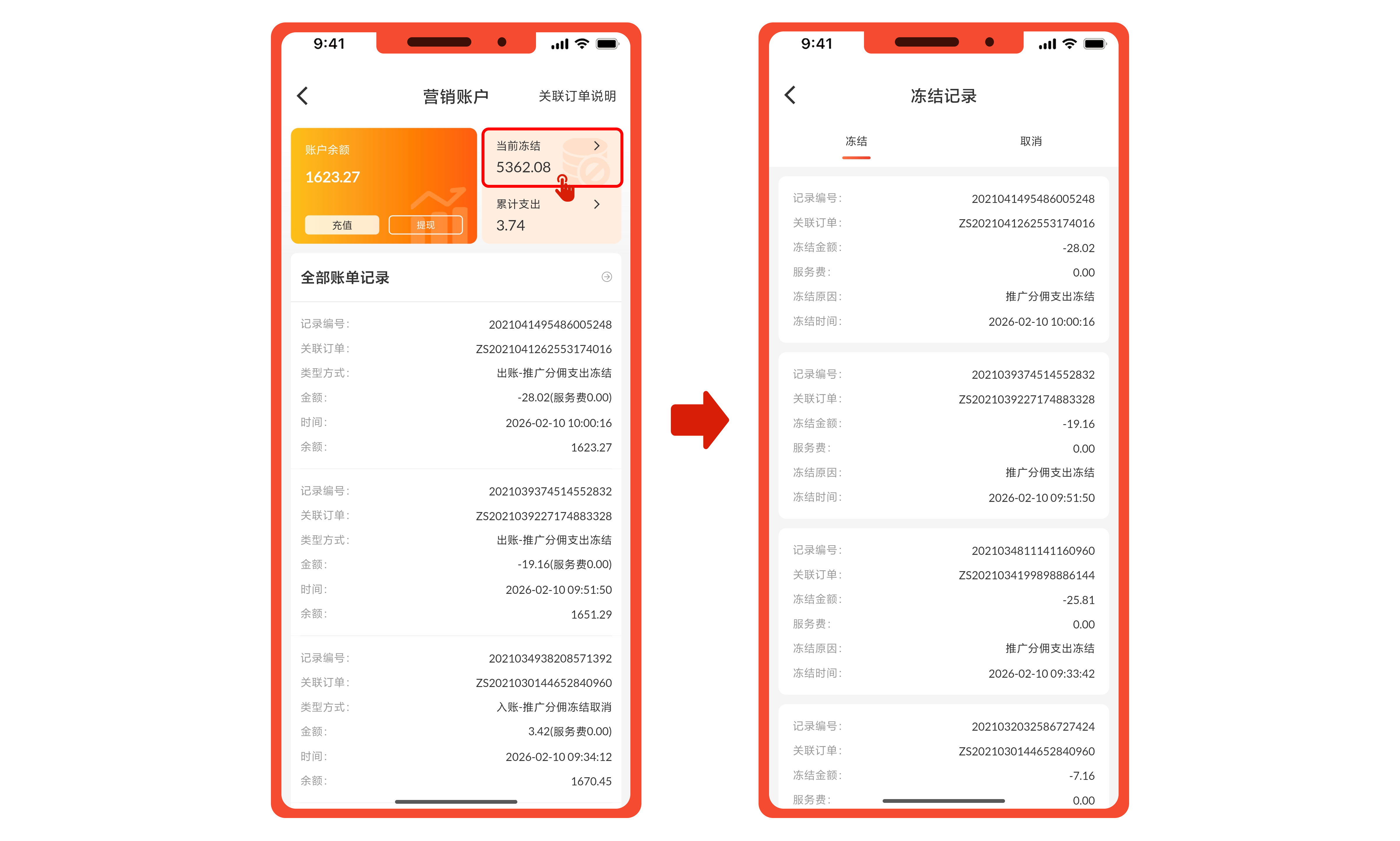 - 合同单全额退款:冻结金额全部取消,全额返还至营销账户余额。