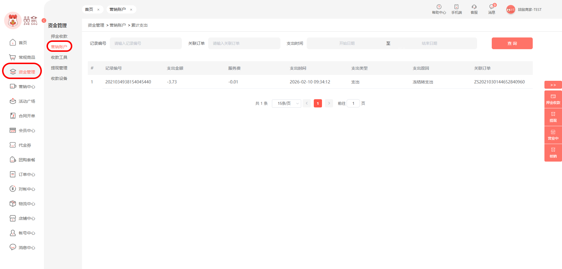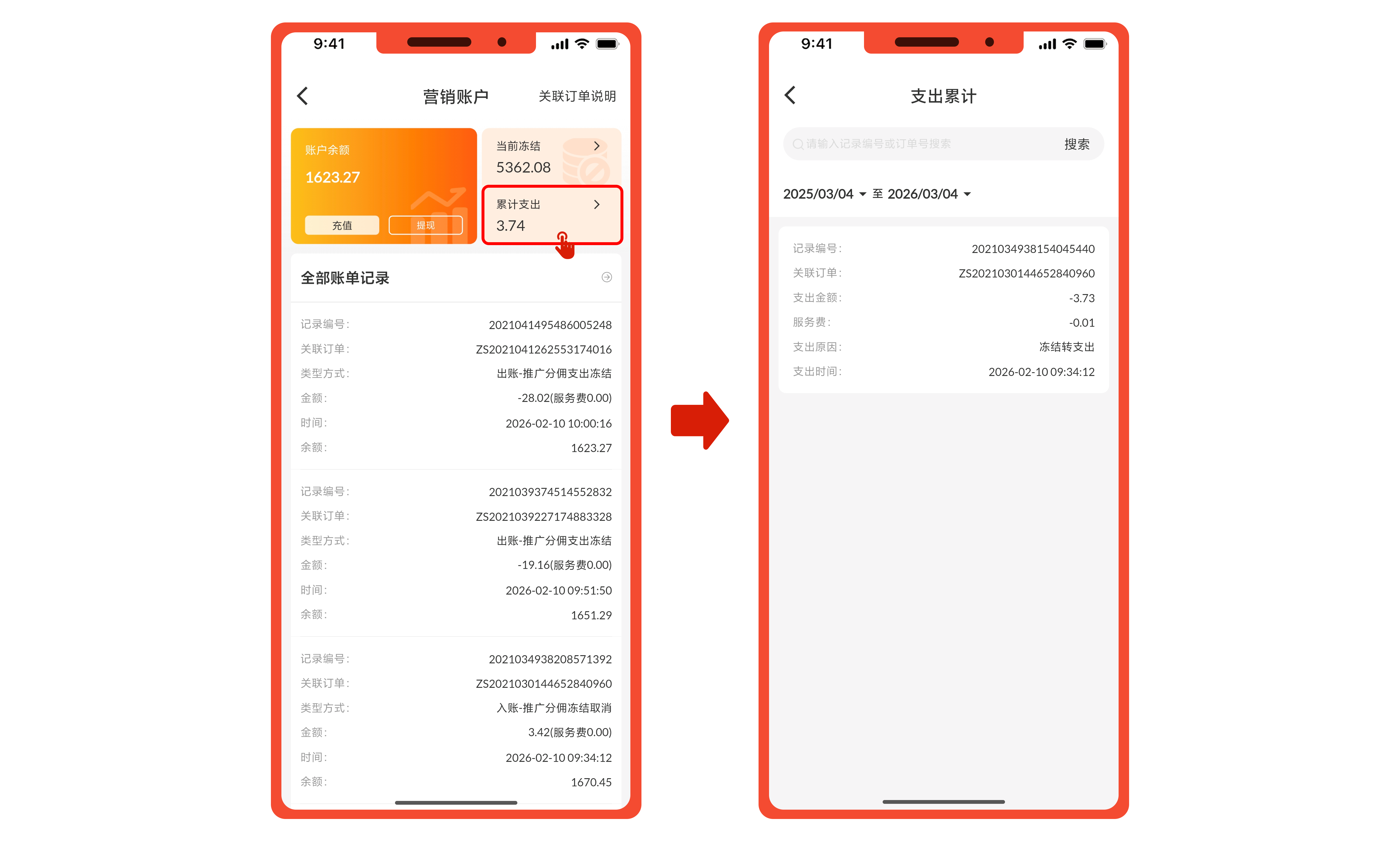点击【累计支出】可查看营销账户实际支出的资金明细,所有支出金额均由合同开单三方收款的冻结资金结转而来。