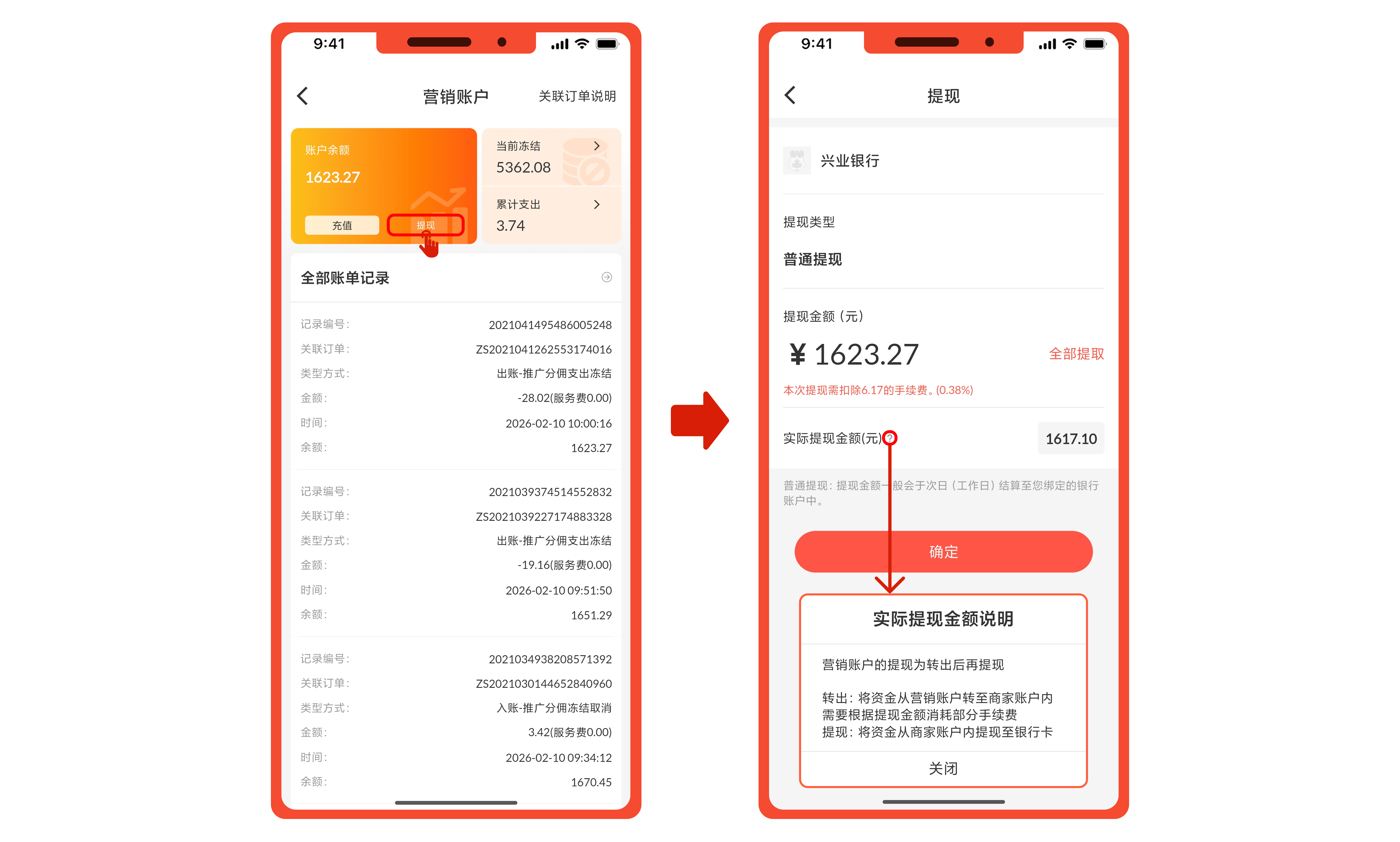 营销账户余额可直接提现至企业绑定的银行账户,提现操作仅需商家在系统完成一步提交,内部结算分为两步,手续费规则如下: