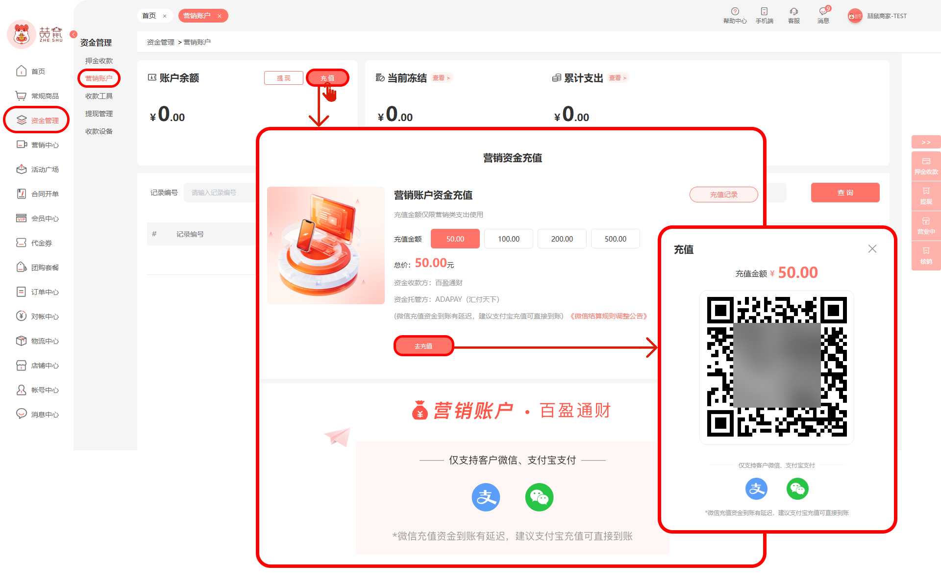 - 支付宝支付:资金支付后直接到账营销账户余额;