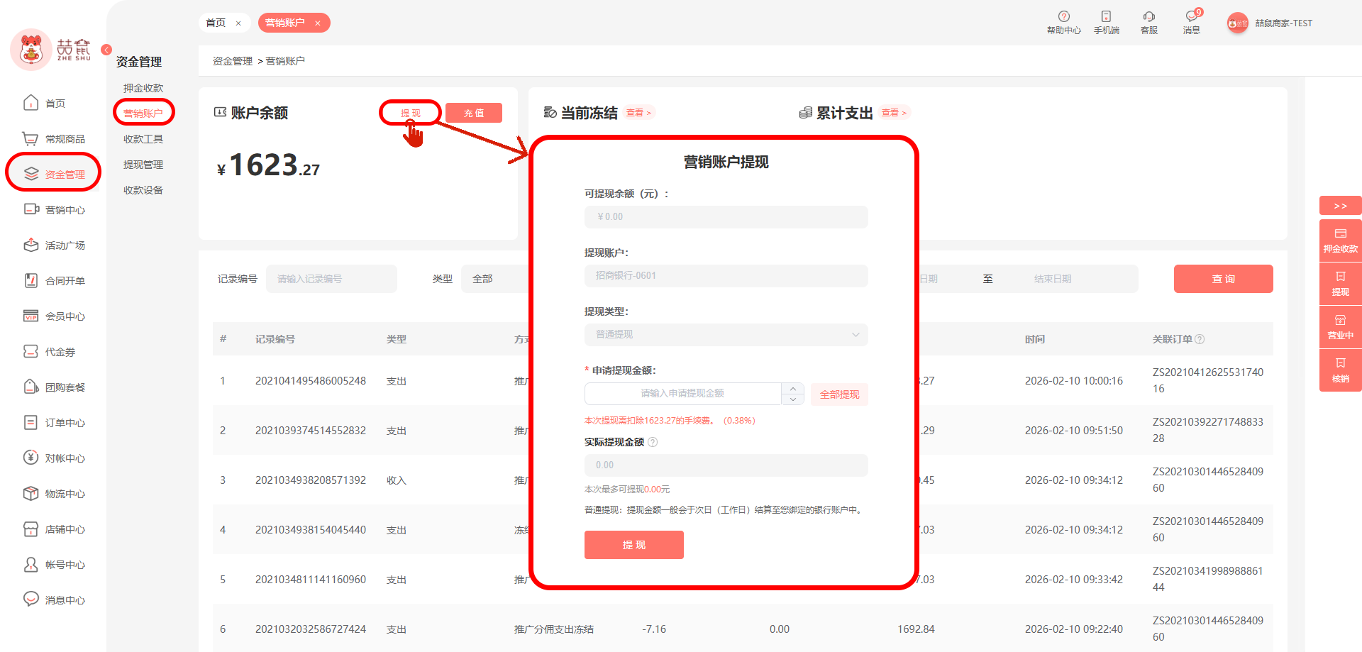 - 第一步:将营销账户余额转出至商家通用余额,该步骤会扣除相应手续费;