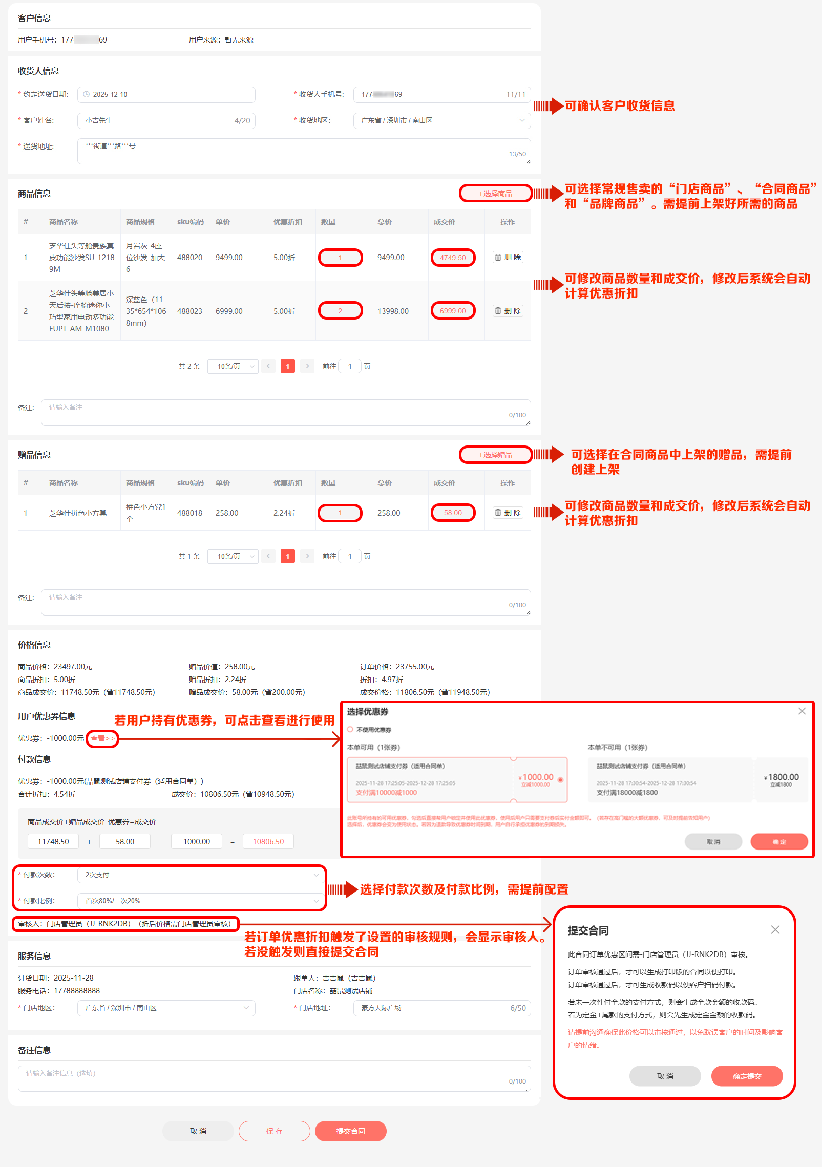 - 赠品信息:赠品仅可从合同商品中选择,需提前上架创建