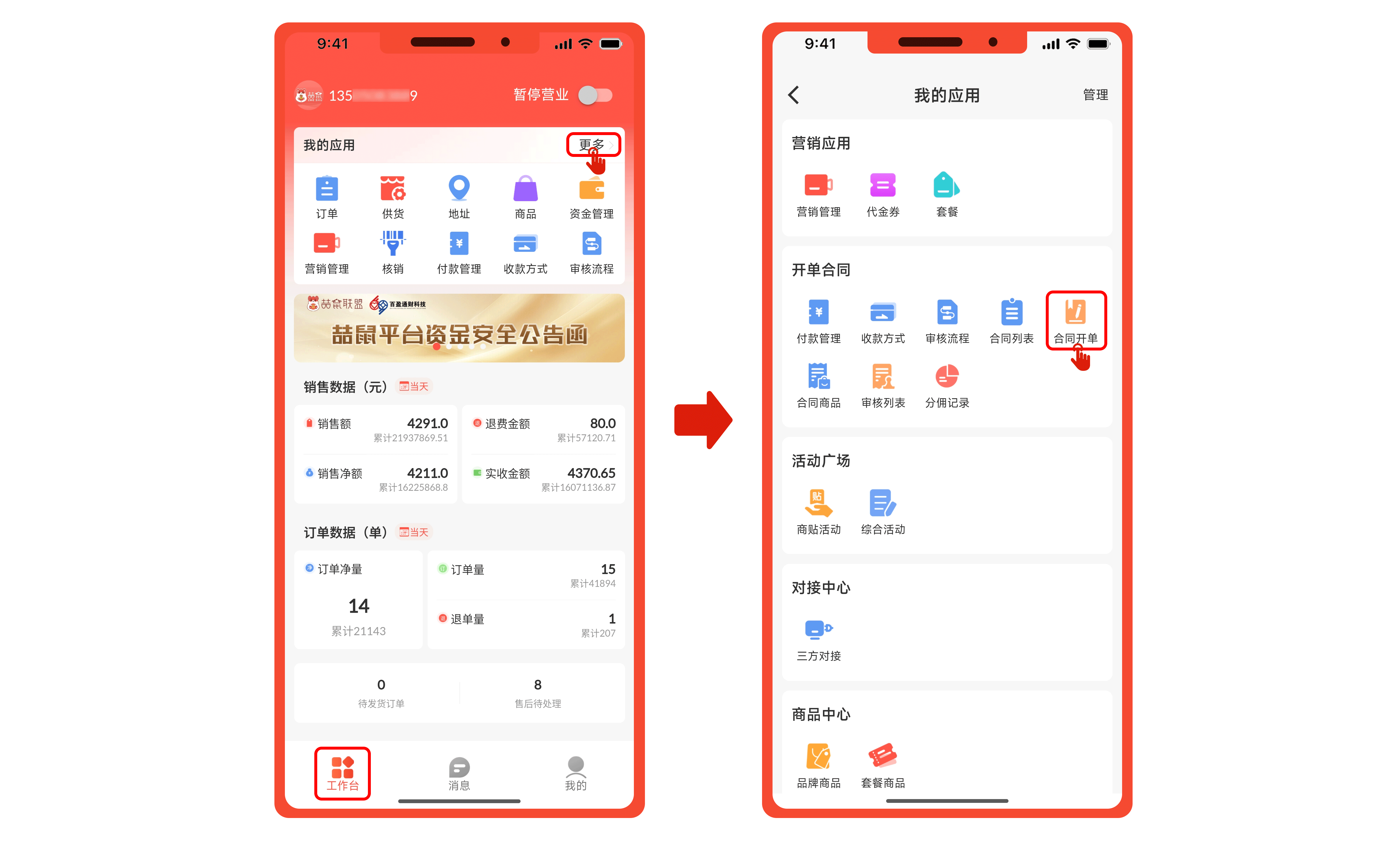 操作路径:底部点击工作台,右上角点击“更多”进入我的应用。下滑找到合同开单处,点击“合同开单”进入开单。