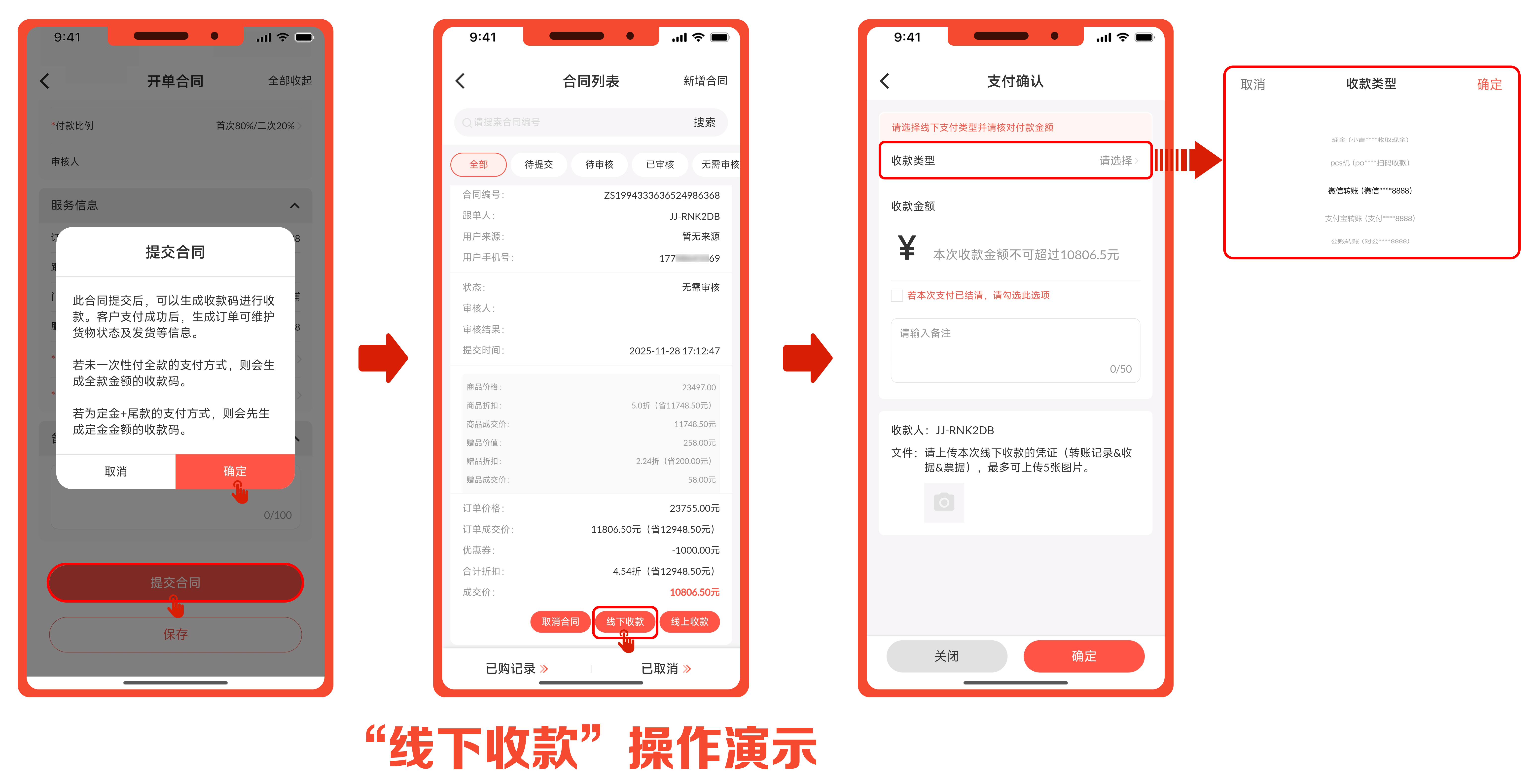 点击提交合同,确认后可以生成收款订单进行收款。可选择“线上付款”或“线下付款”进行收款。客户支付成功后,生成订单可维护货物状态及发货等信息。