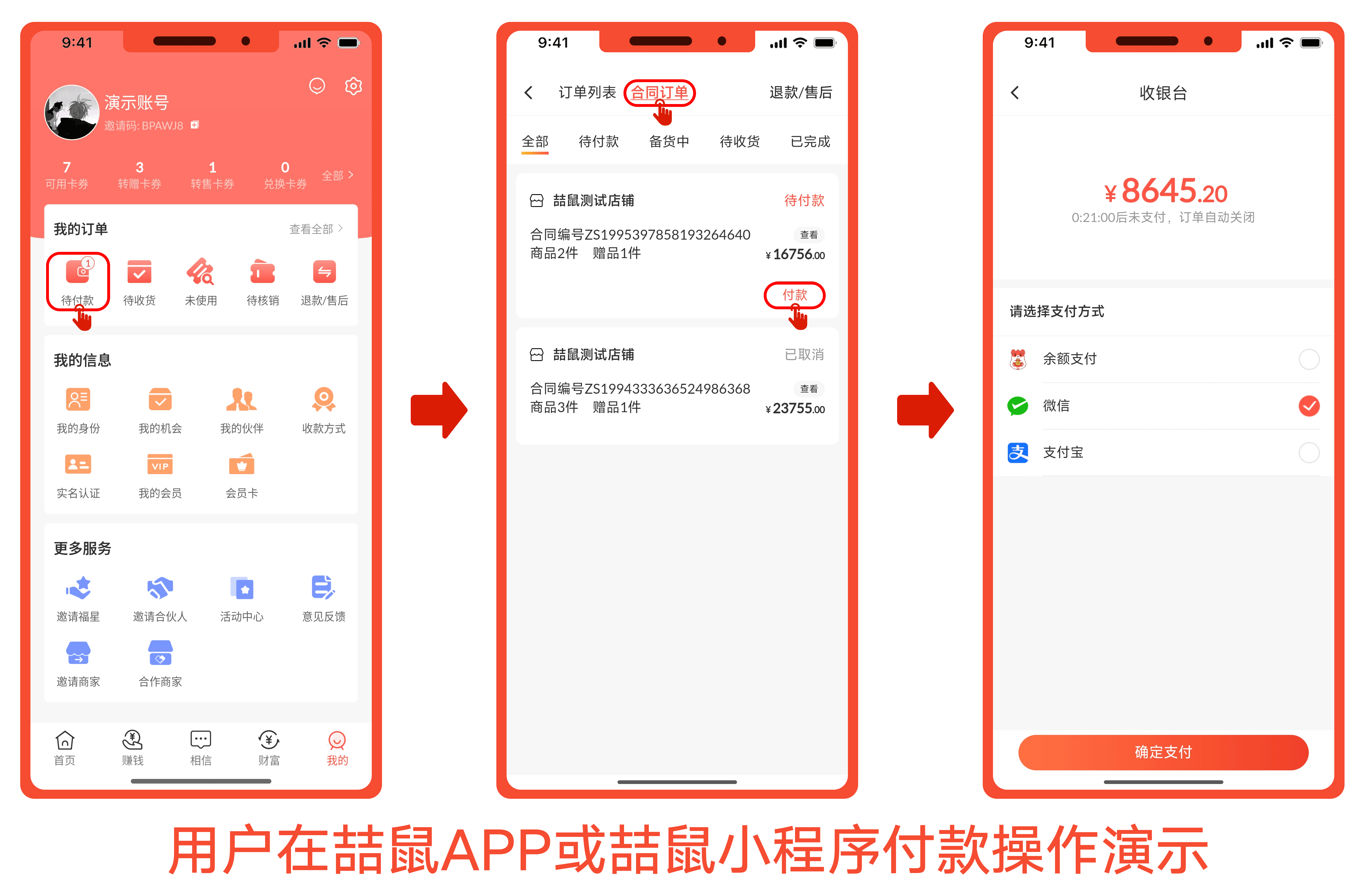 用户也可使用扫码授权开单的手机账号登录喆鼠APP或喆鼠小程序,点击底部“我的->我的订单->合同订单”进入付款。