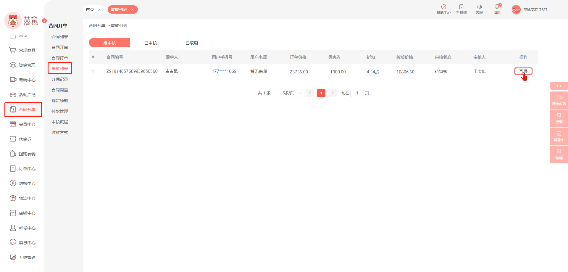 审核路径:点击“合同开单->审核列表”进入审批即可。
