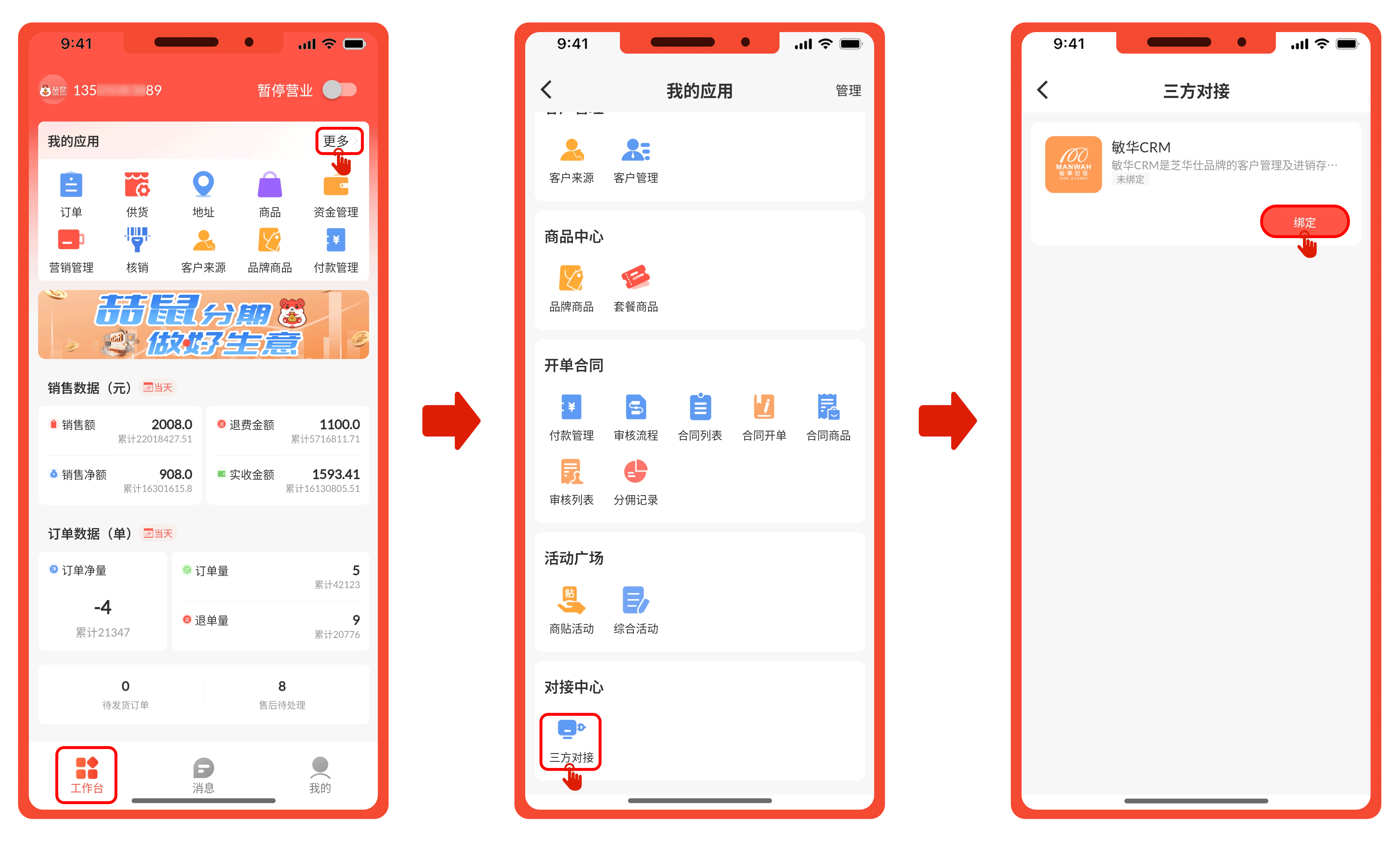 打开喆鼠商家APP,在【工作台】页面点击右上角“更多”进入,点击【对接中心→三方对接】,进入绑定页面。