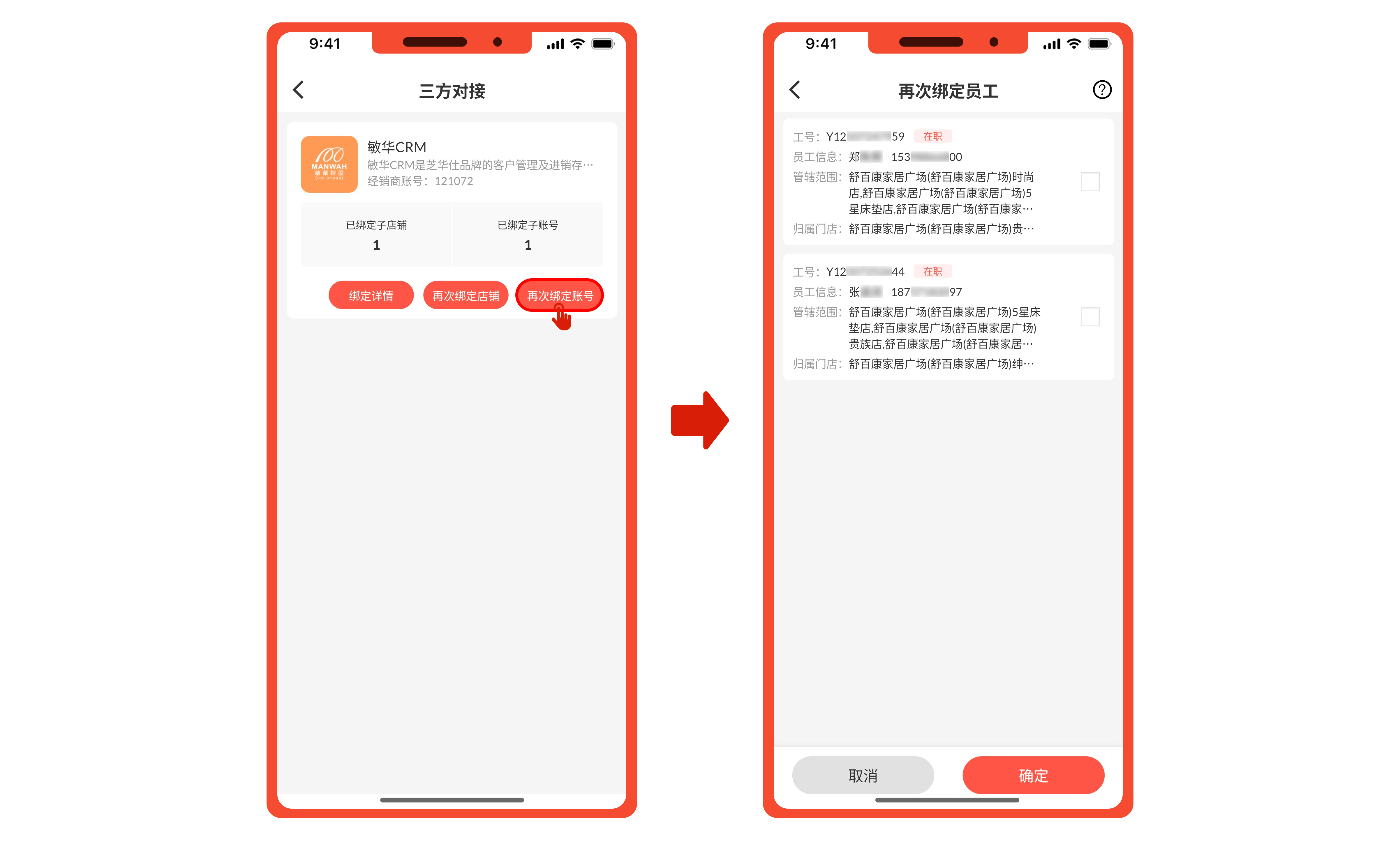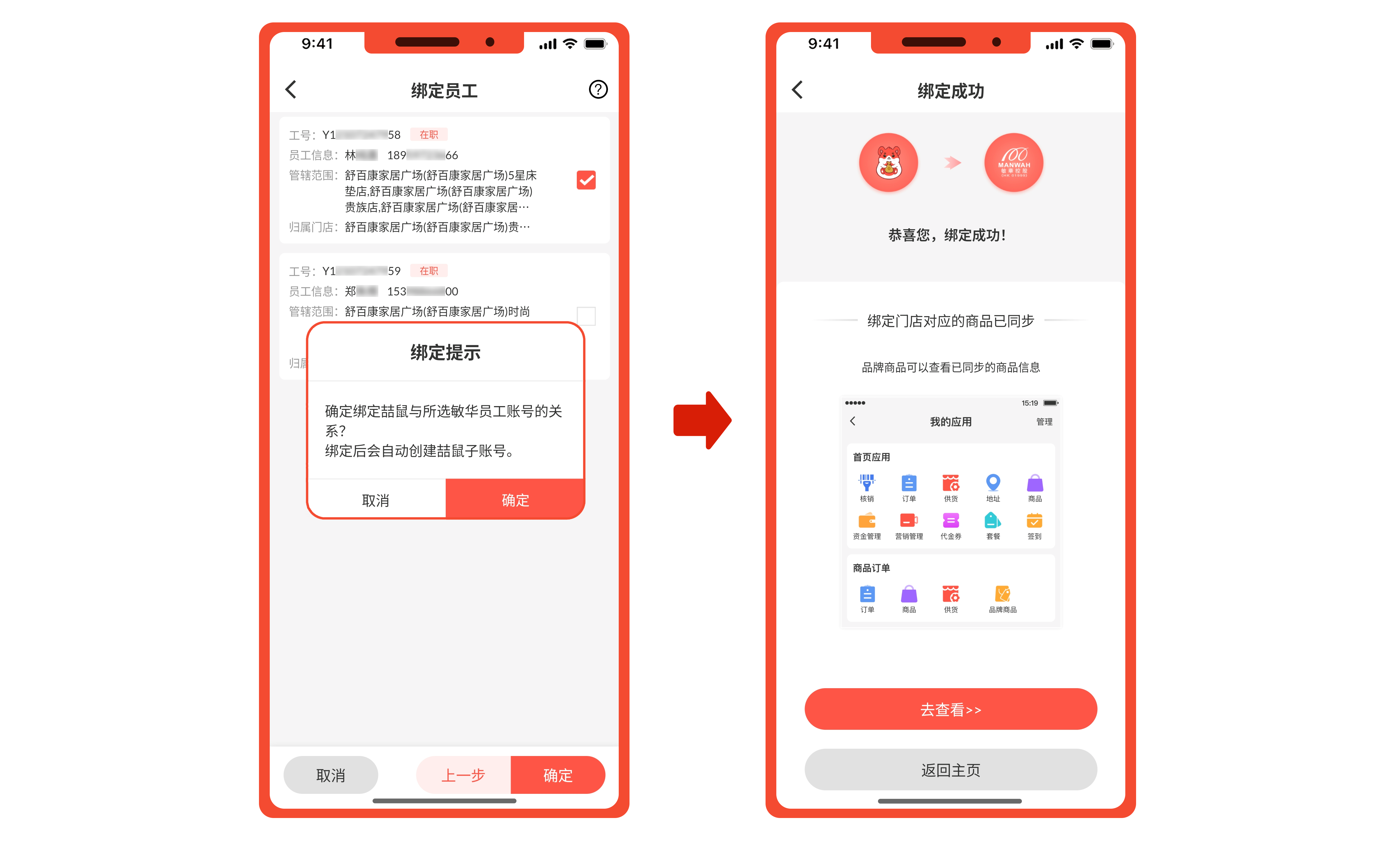 门店绑定成功后,可获取此经销商下面的所有在职员工账号信息,选择员工进行绑定即可。