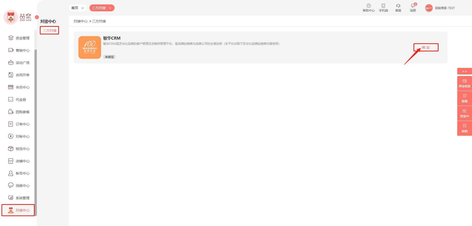 点击【对接中心-三方对接】,点击“绑定”进入。