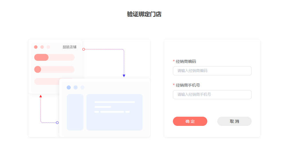 输入经销商编码与经销商手机号,进入后可获取此经销商下面的所有子门店,选择门店进行绑定。