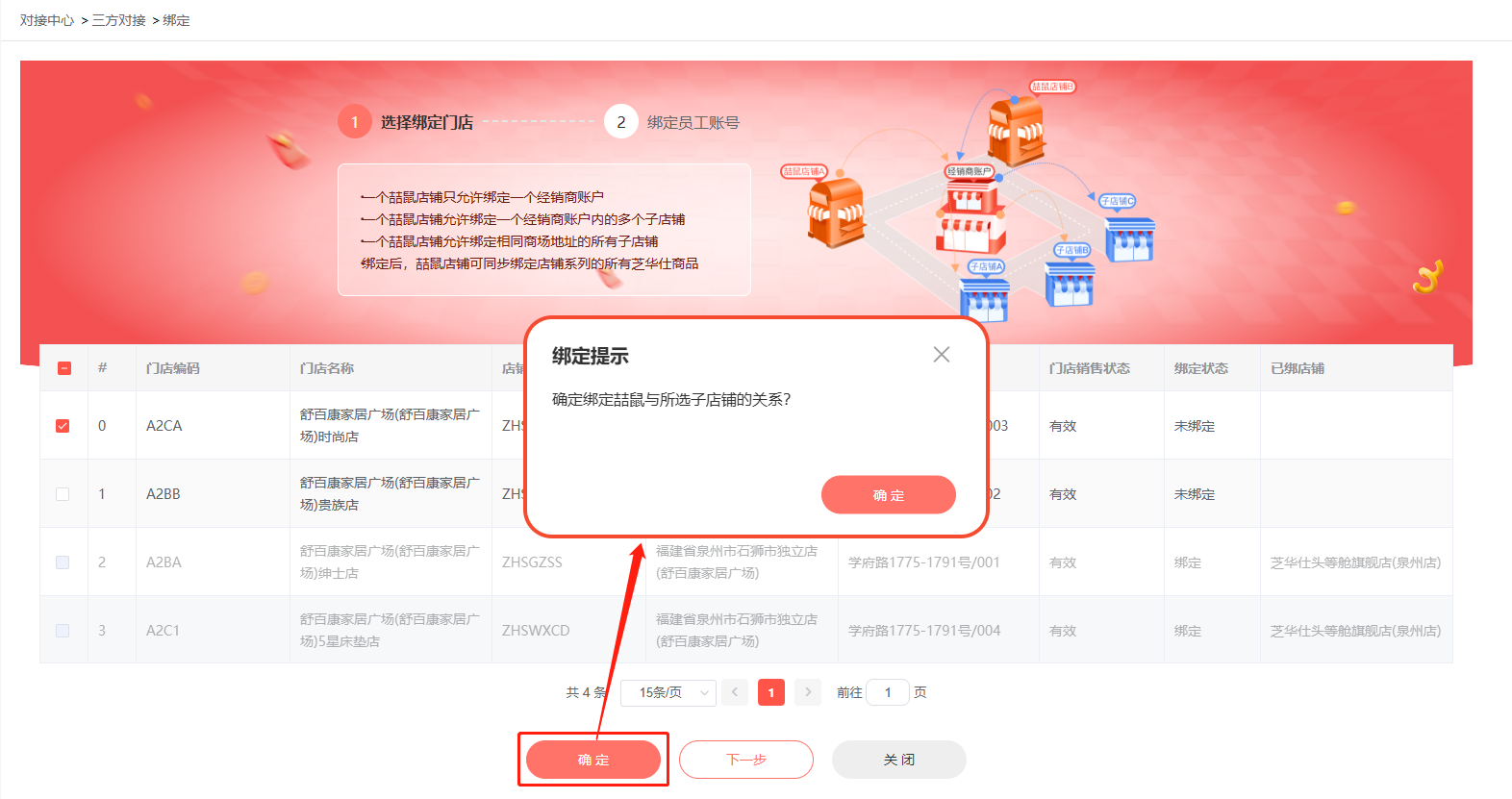 进入后可获取此经销商下面的所有子门店,选择对应门店后,点击“确定”进行绑定,绑定成功后点击“下一步”。