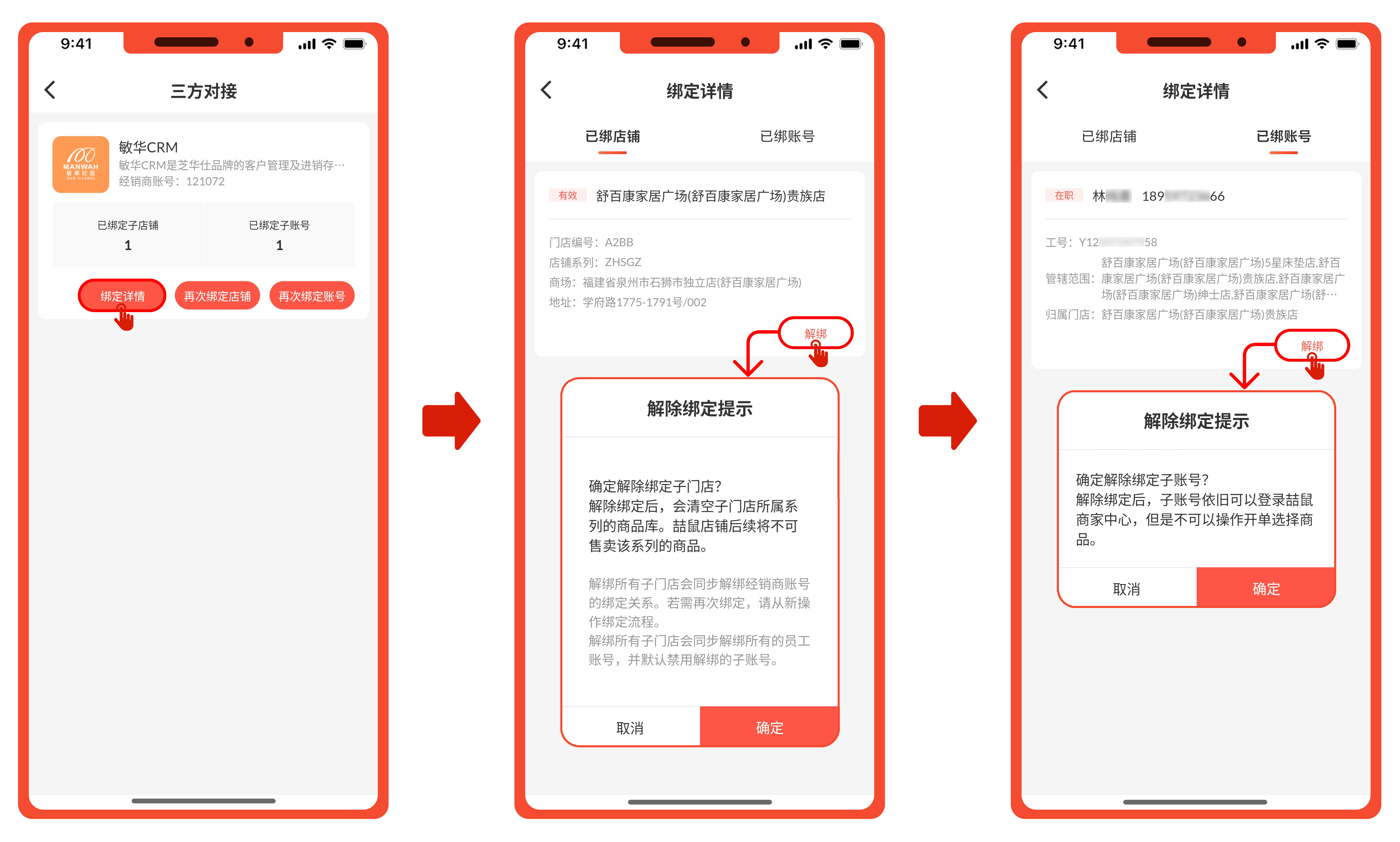• 解绑所有子门店会同步解绑经销商账号的绑定关系。若需再次绑定,请从新操作绑定流程。