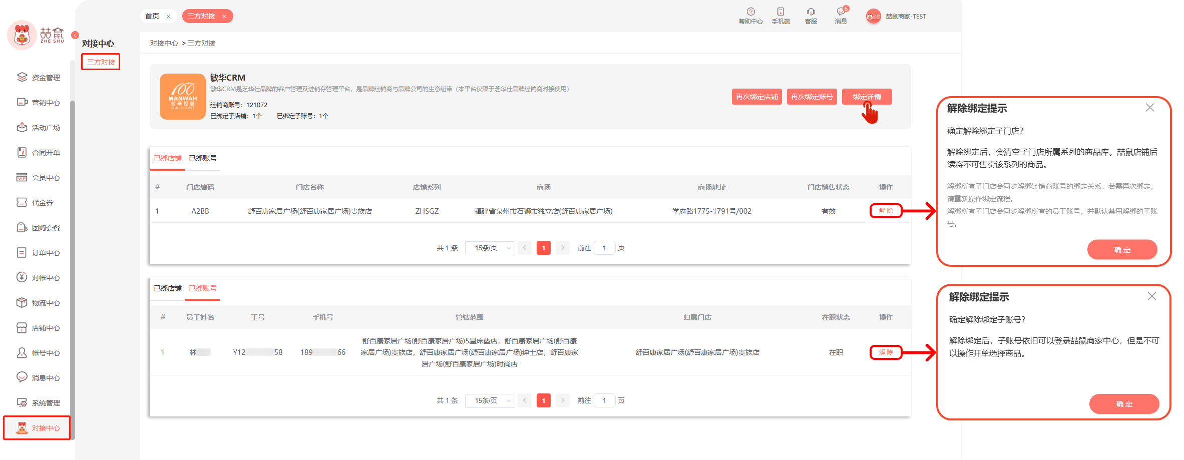 绑定成功后,点击绑定详情可查看已绑定的店铺和员工账号。可对其进行解绑。