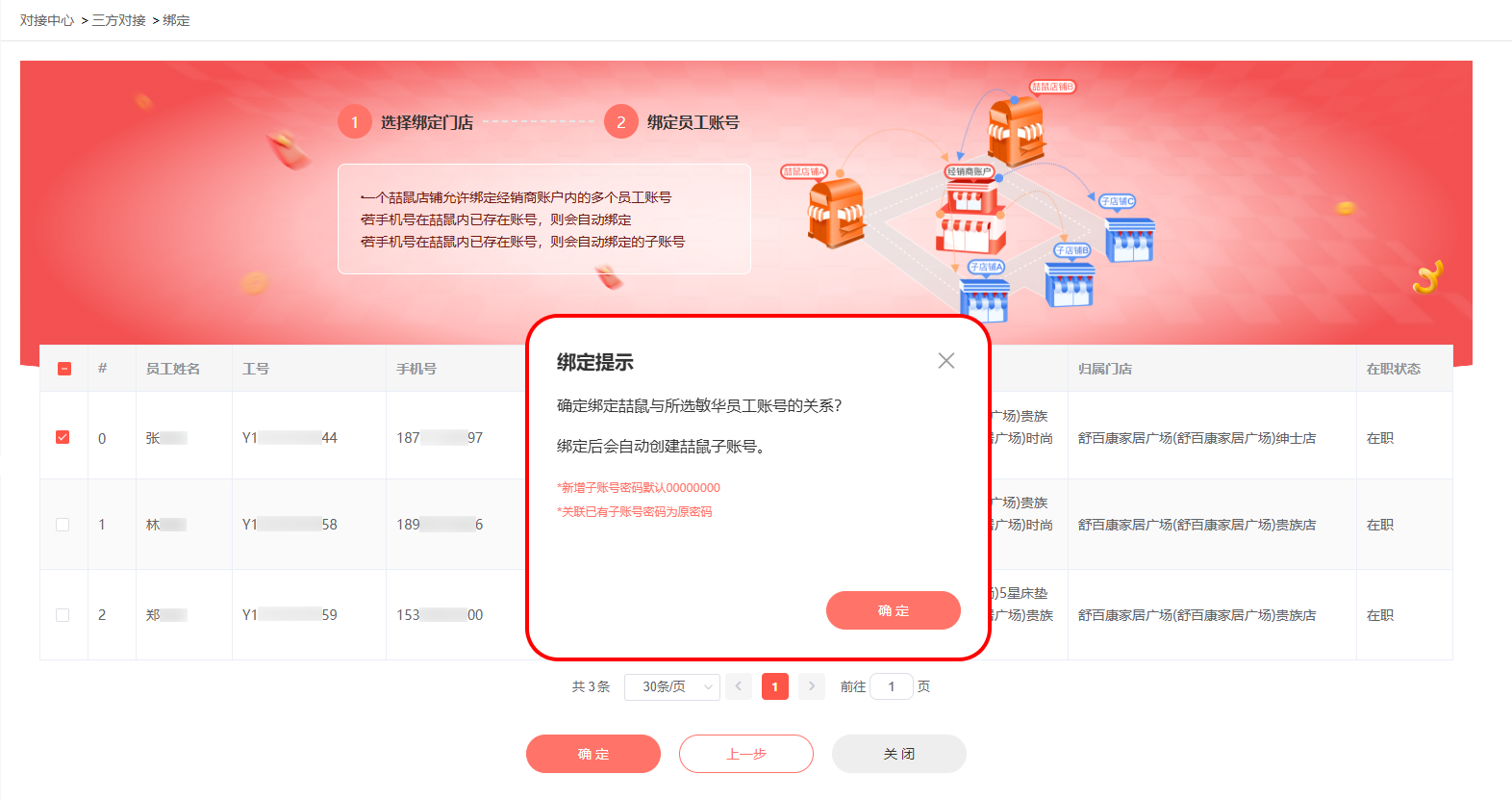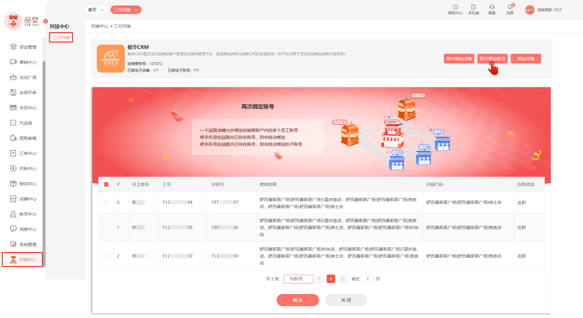 • 绑定后,未在喆鼠创建子账号的手机号会自动生成喆鼠店铺的子账号
