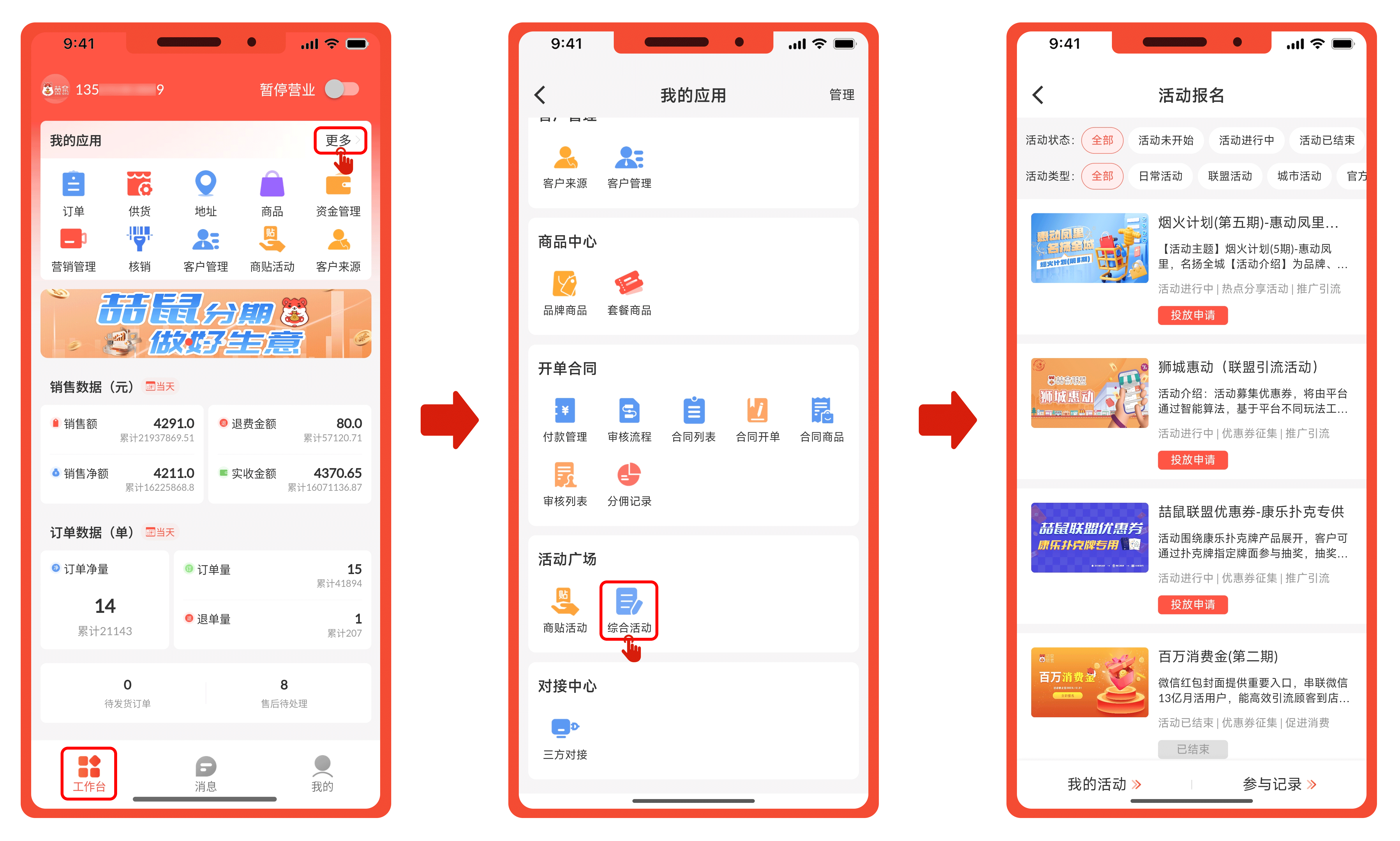 打开喆鼠商家APP,在【工作台】页面点击右上角“更多”进入,点击【活动广场→综合活动】,进入活动页面。