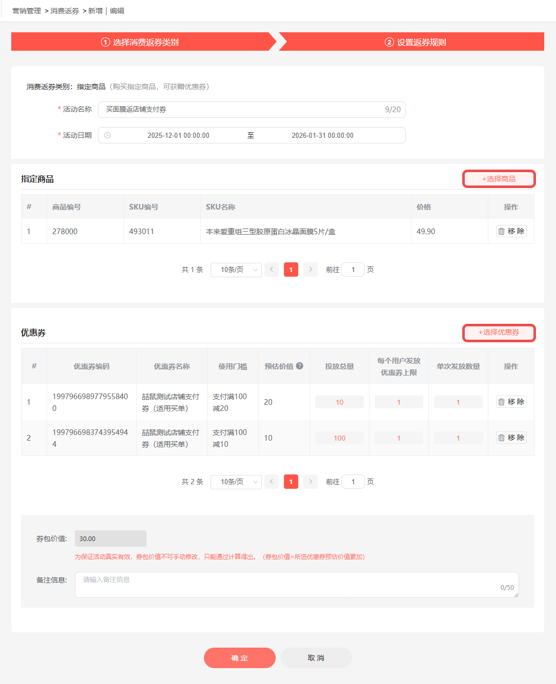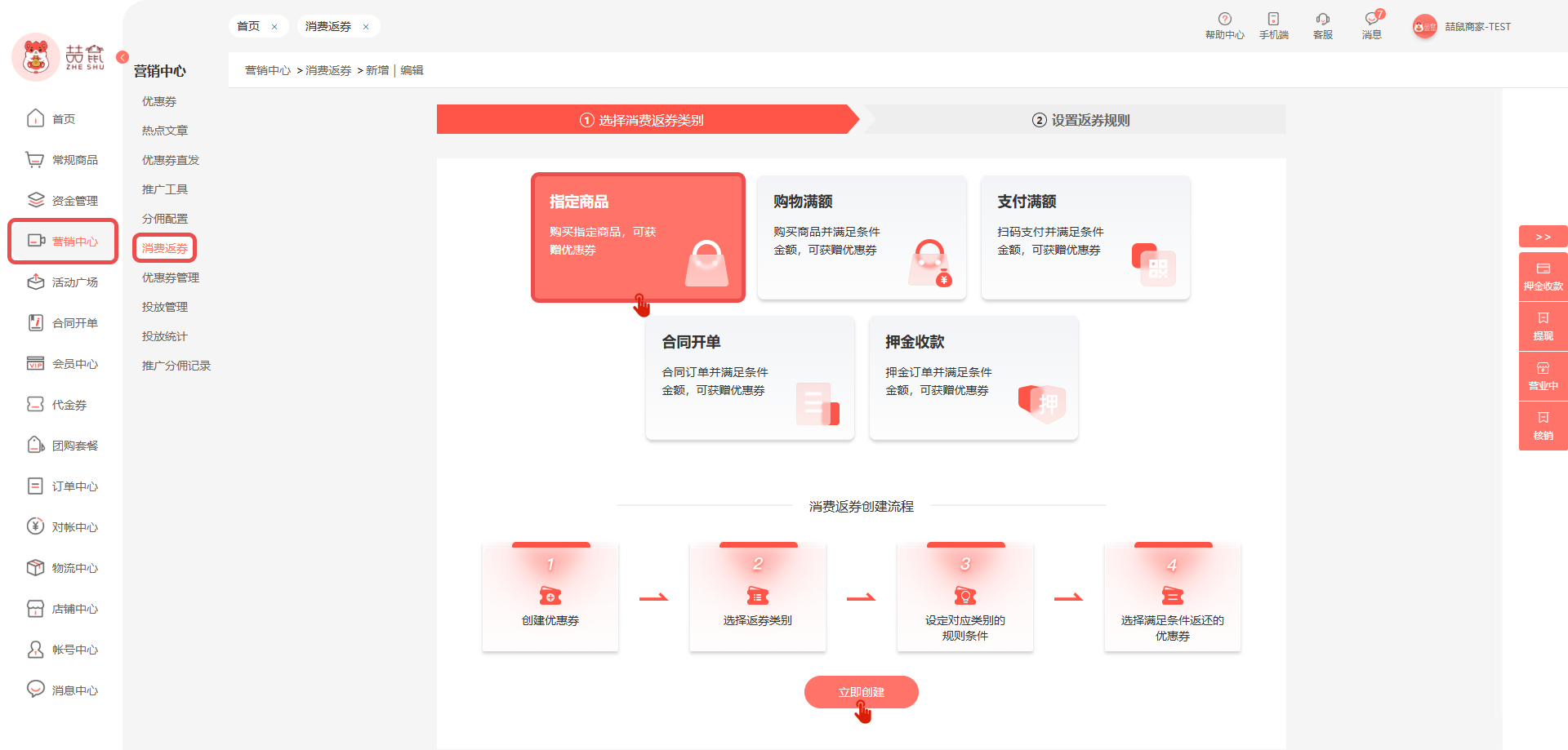 操作路径:营销管理->消费返券->新增->指定商品