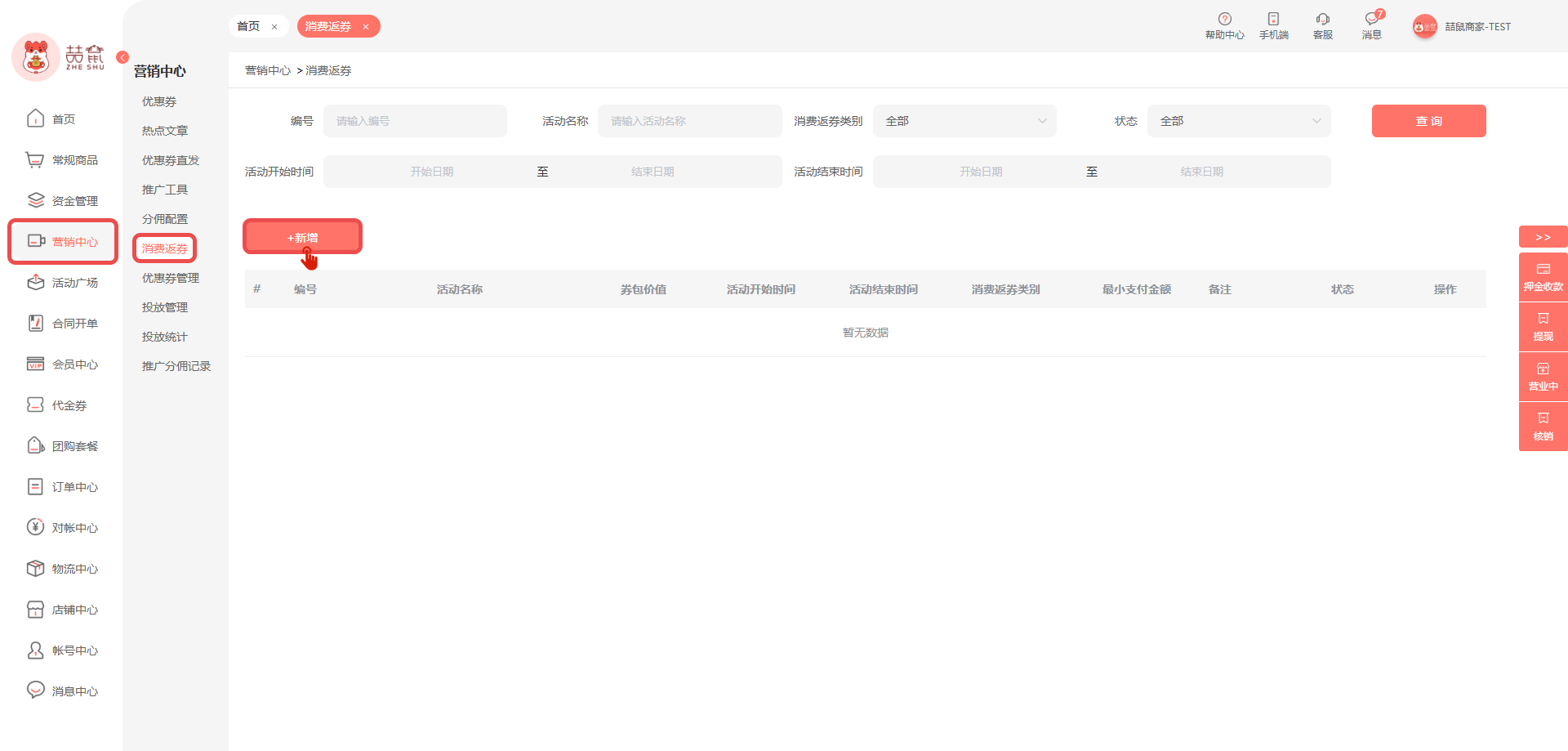 消费返券共有5种类别:指定商品、购物满额、支付满额、合同开单、押金收款