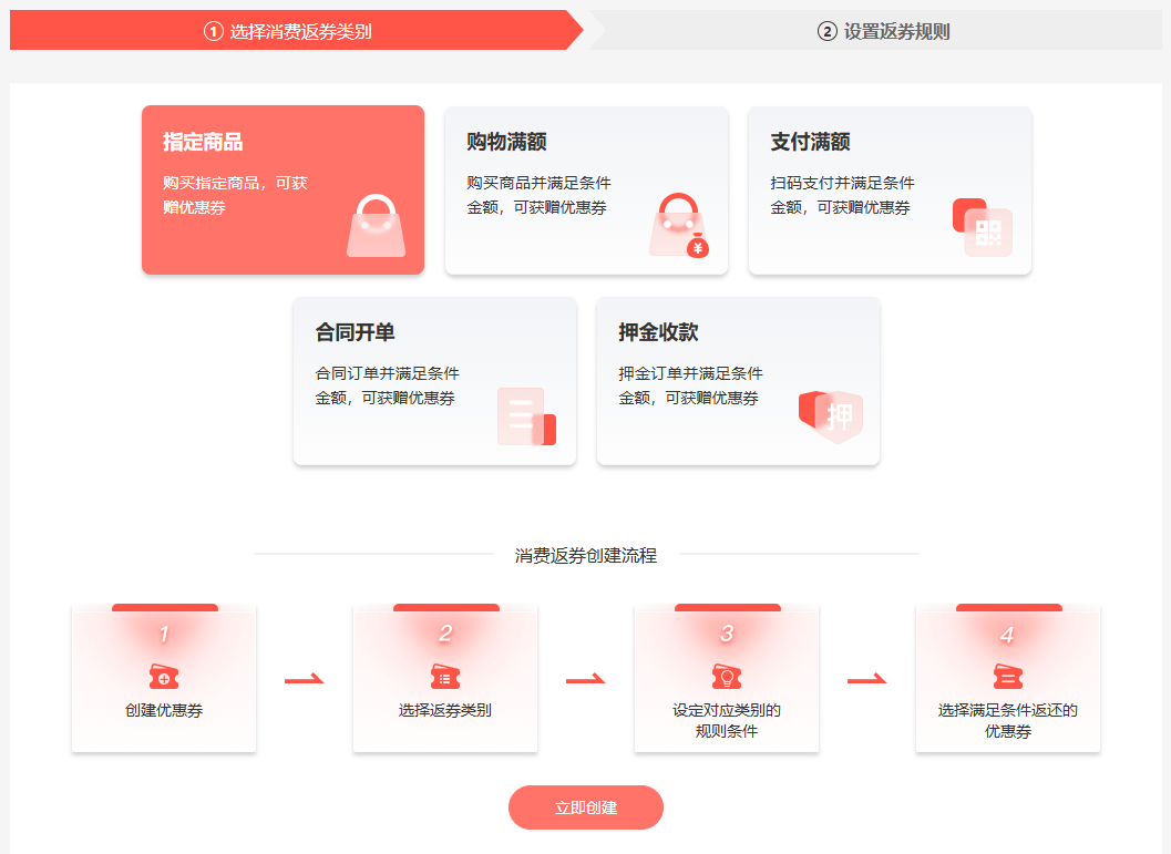 ①创建优惠券->②选择返券类别->③设定对应类别的规则条件->④选择满足条件返还的优惠券