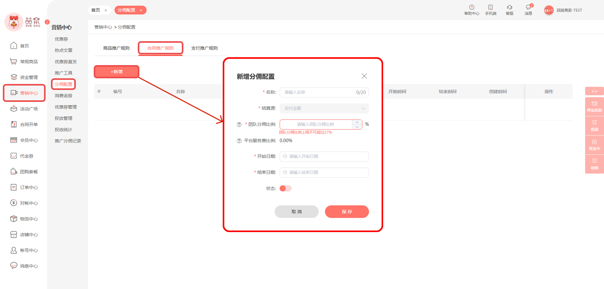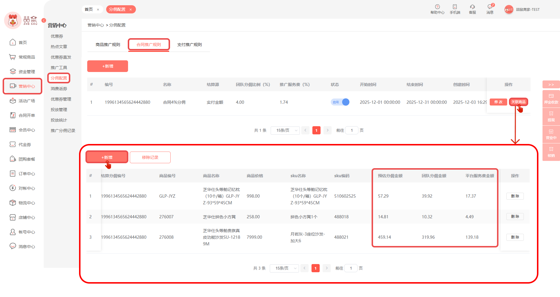 同一个商品仅能参与一个合同分佣活动,如需参与其他合同比例的活动,可手动删除重新关联。