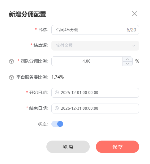- 平台服务费比例:基于合伙人分佣算法随团队分佣比例动态计算,为平台服务费。