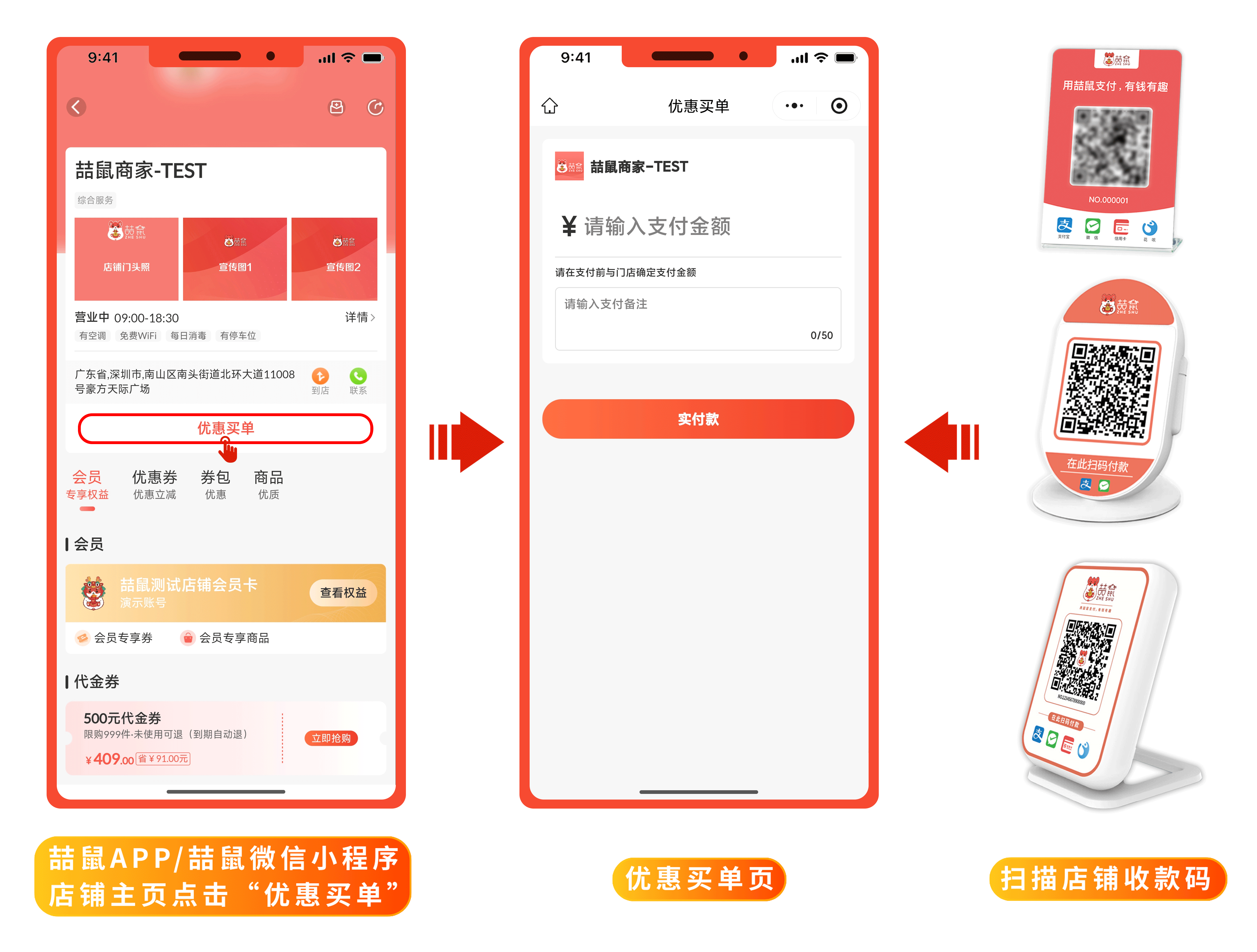 ③用户通过喆鼠APP自主浏览店铺并通过“优惠买单”付款