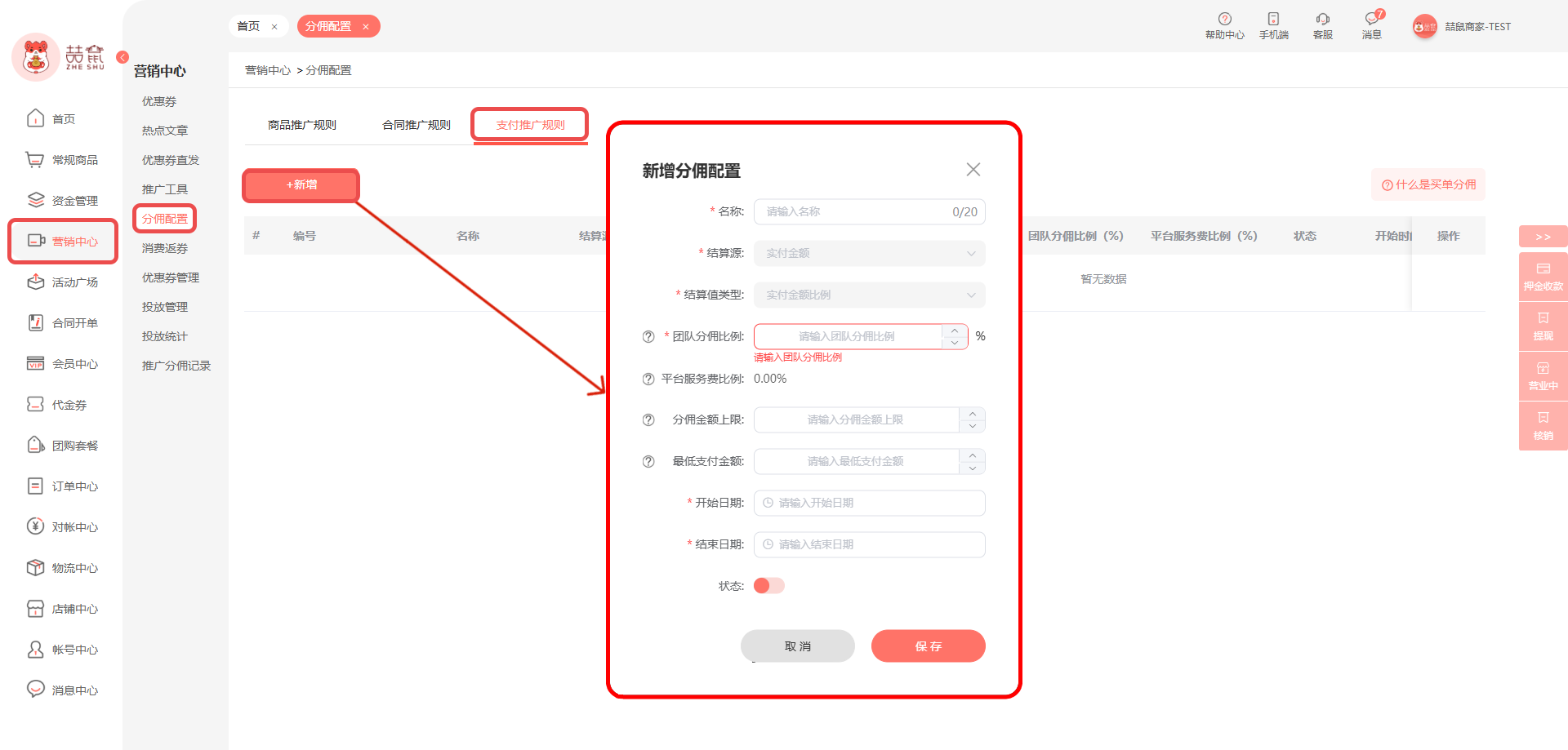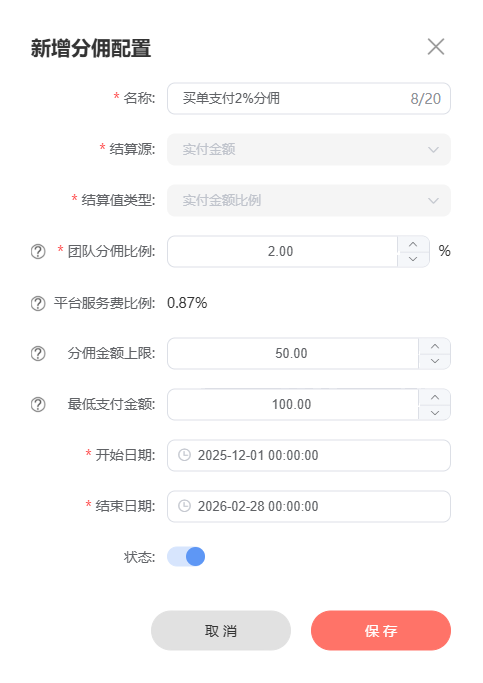 - 分佣金额上限:控制每笔支付最高分佣金额+平台服务费比例,超过此金额按照此金额分佣,未超出则按照计算金额分佣。