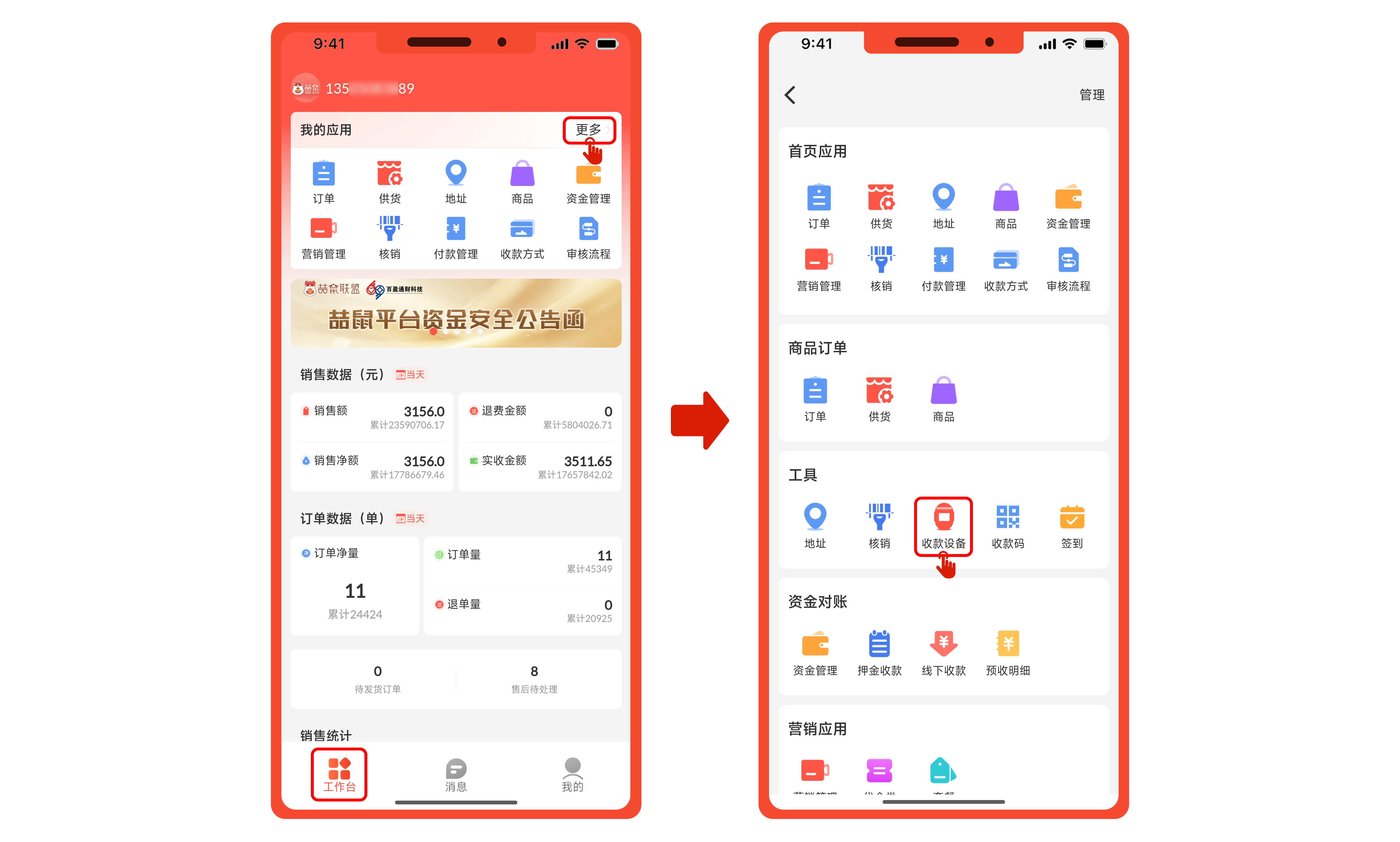 操作路径:打开喆鼠商家APP,点击【工作台】→【我的应用】,点击“更多”进入。点击【工具】→【收款设备】即可开始绑定。