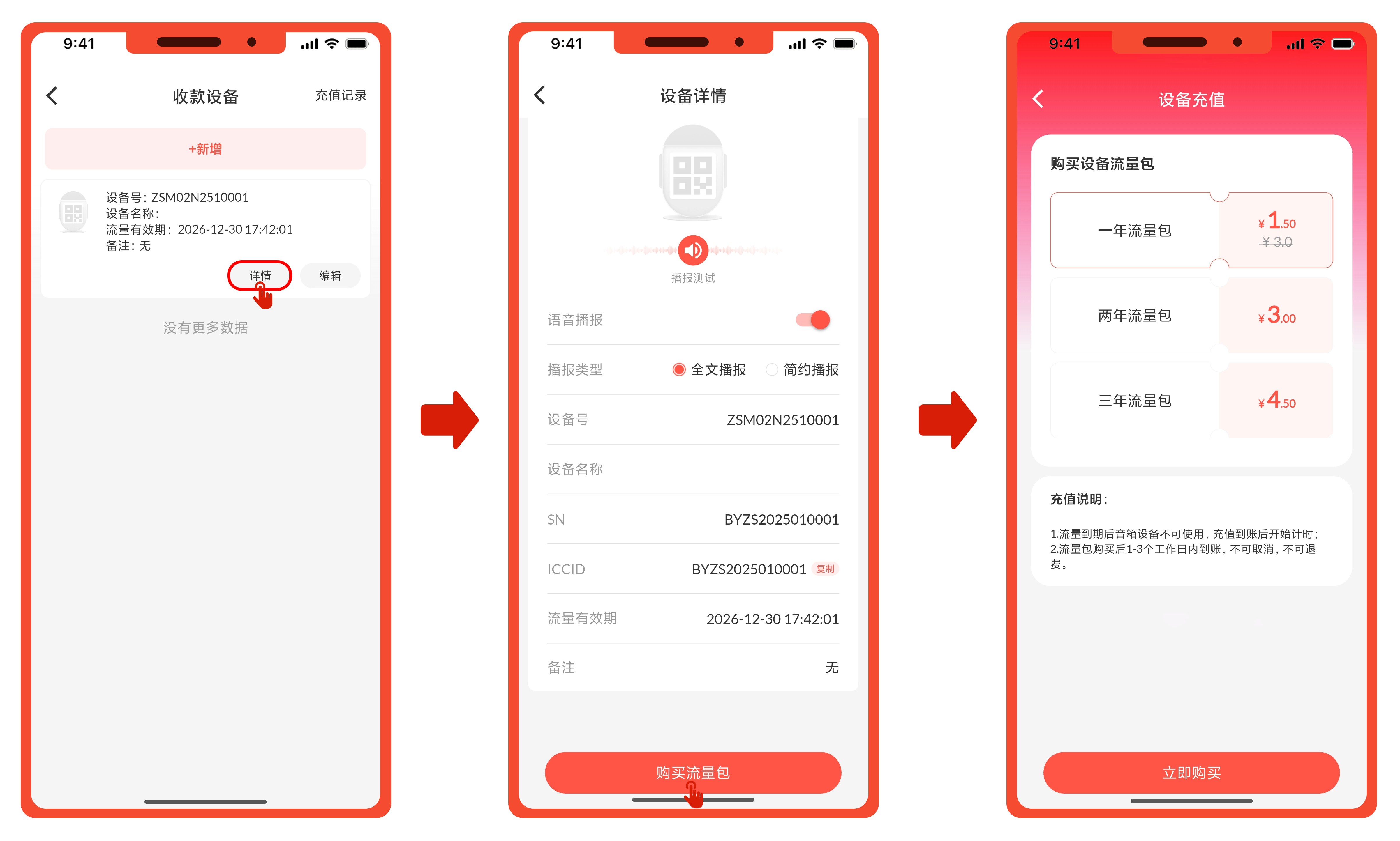 - 进入设备详情页面,点击底部“购买流量包”