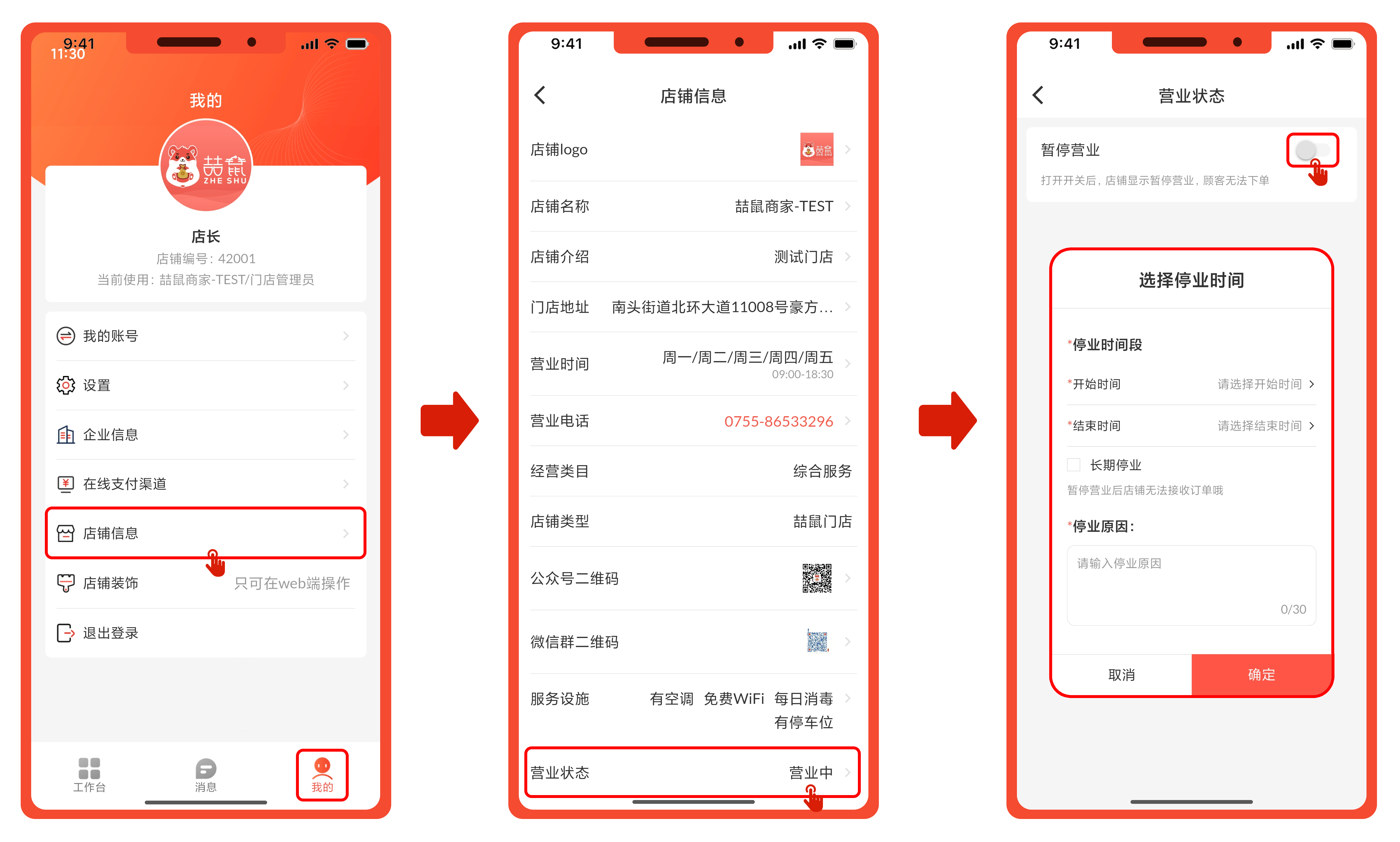 操作路径:打开喆鼠商家APP,点击底部导航栏“我的->店铺信息”,底部点击“营业状态”进入设置页面。