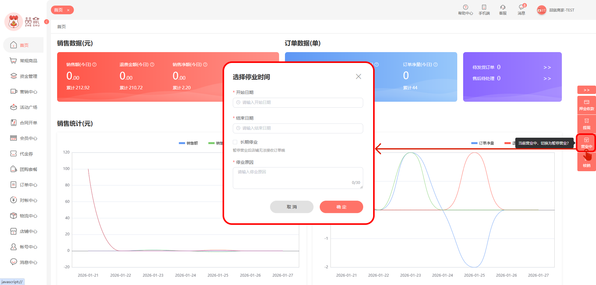 登录喆鼠商家中心后台,点击页面右侧营业按钮操作
