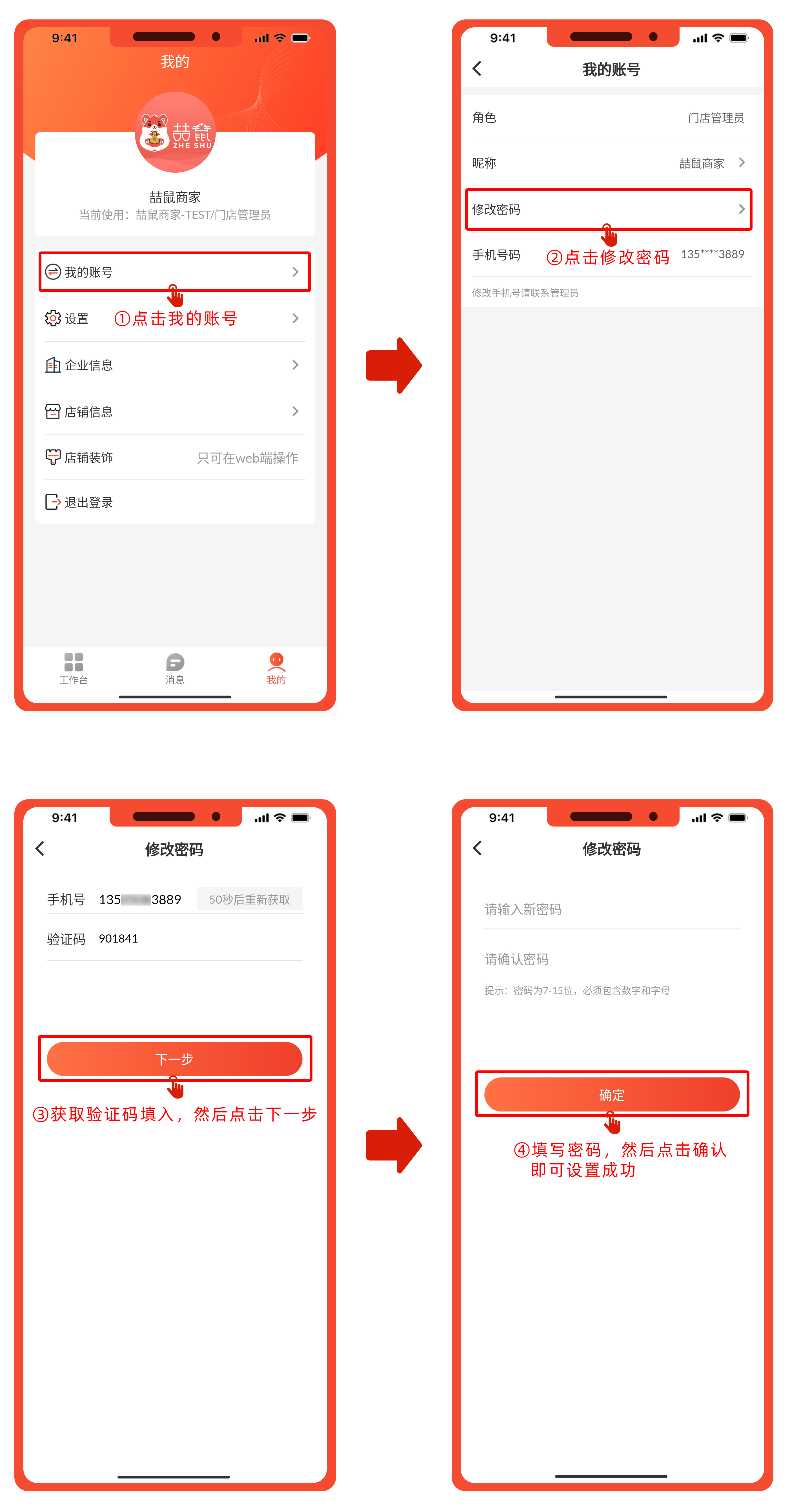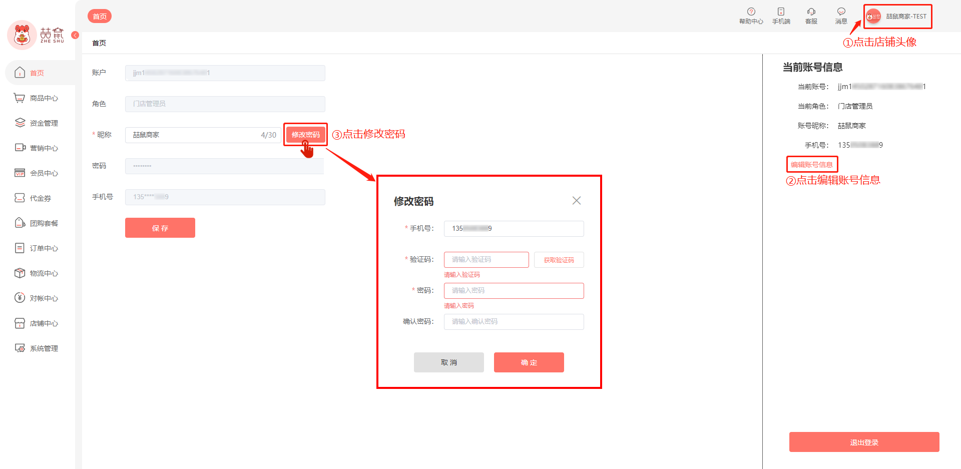 操作路径:点击右上角的【店铺头像】→【编辑账号信息】,然后点击【修改密码】即可设置和修改密码。