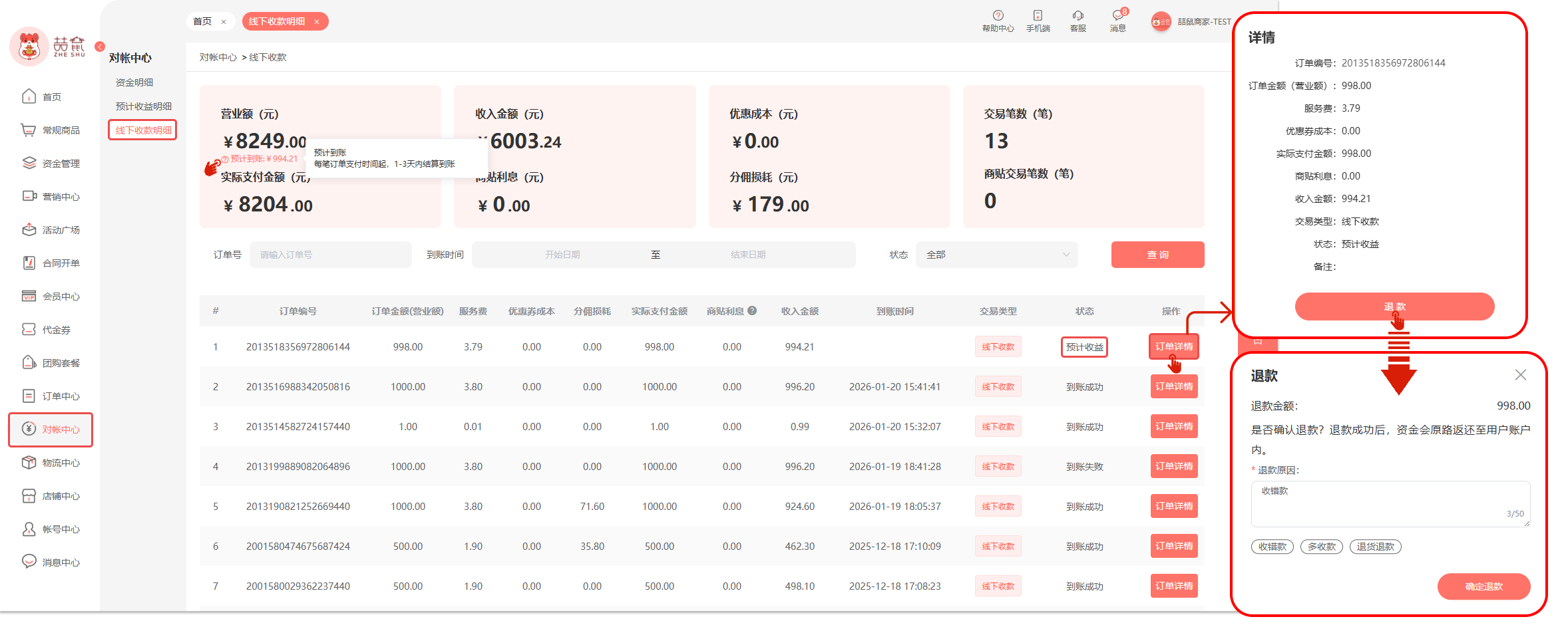 当订单状态为【预计到账】时,点击“订单详情”可进行退款操作。(该操作仅支持通过微信支付的订单进行操作)