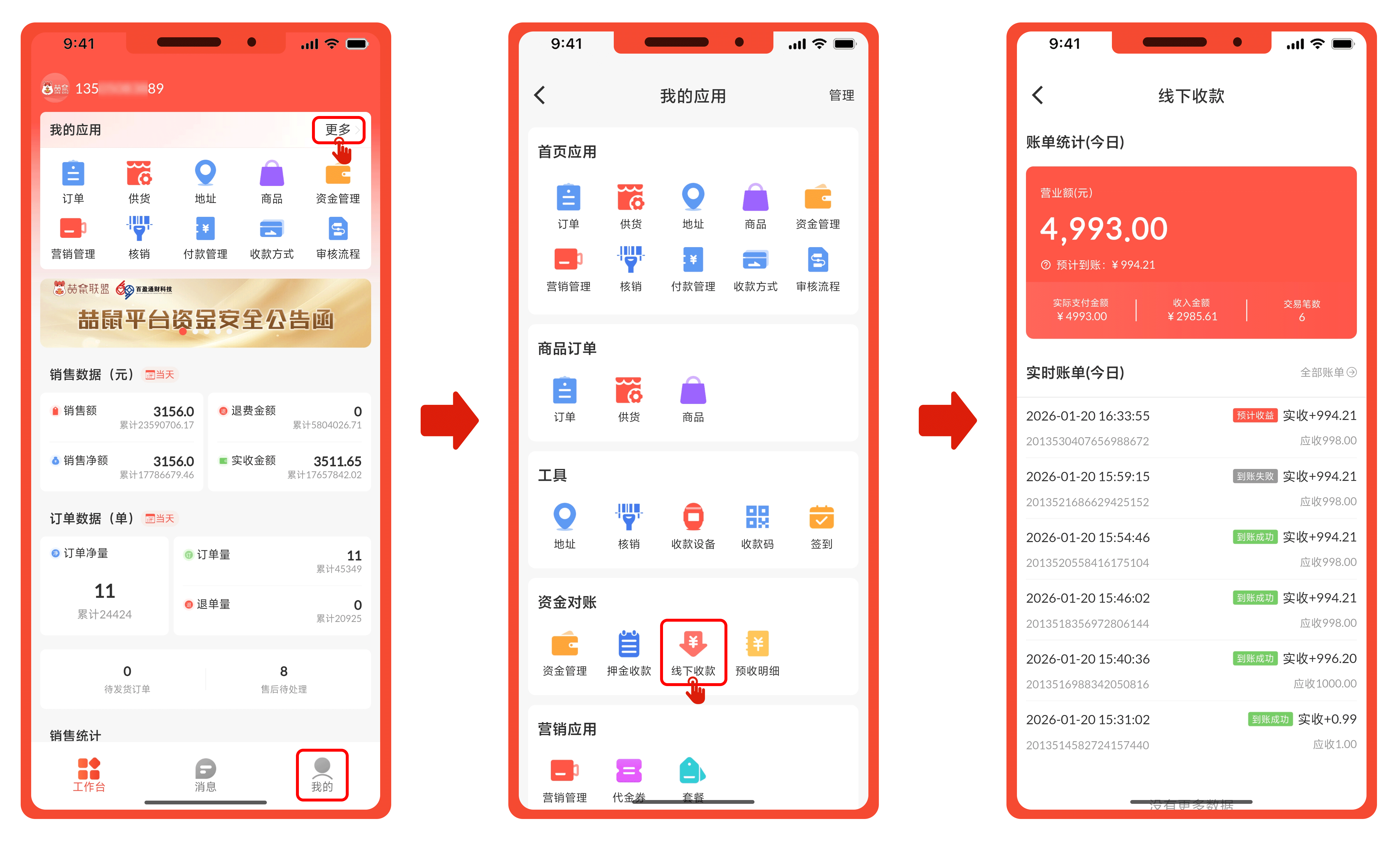 查看路径:打开喆鼠商家APP,点击【工作台】→【我的应用】,点击“更多”进入。点击【资金对账->线下收款】