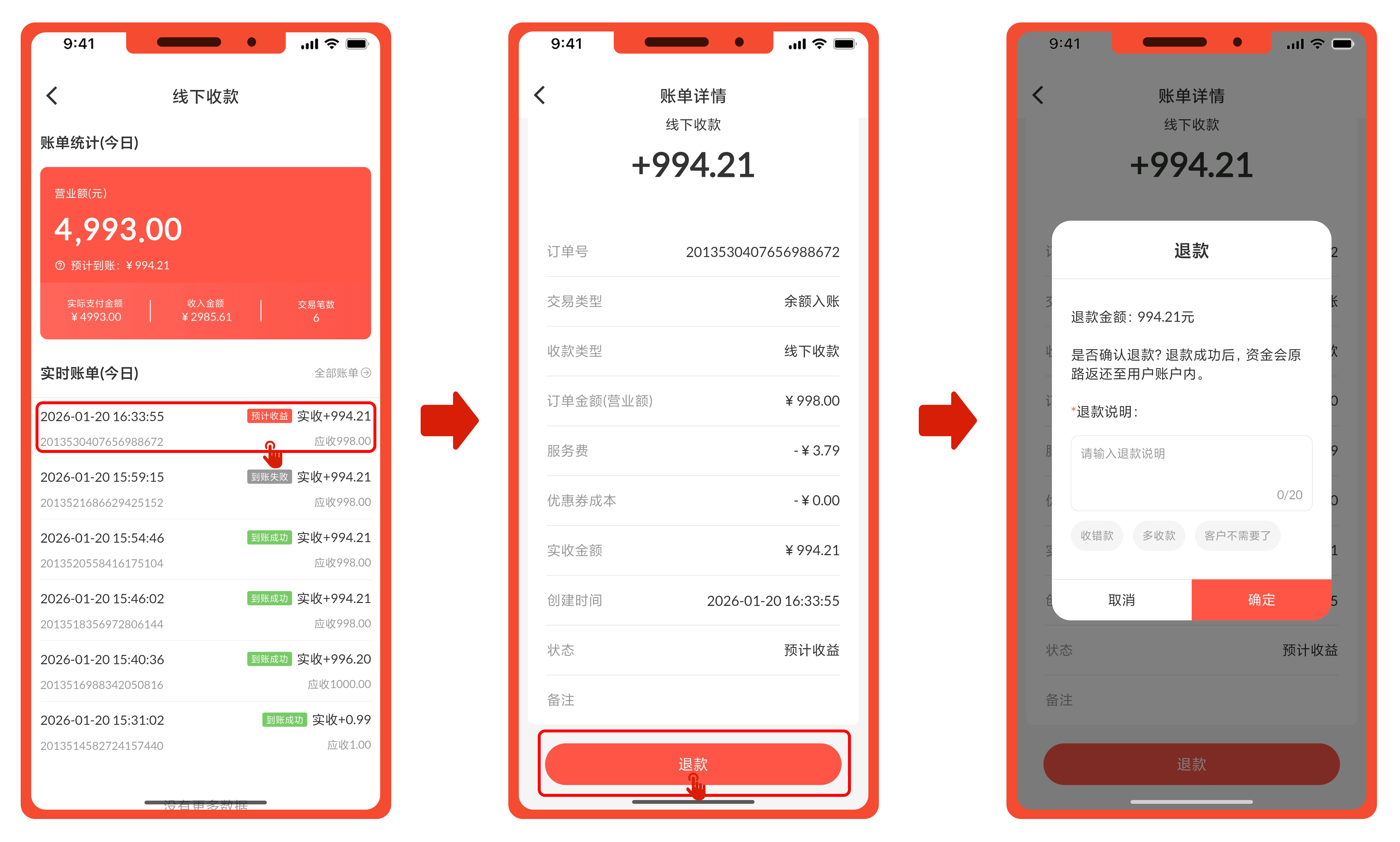 当订单状态为【预计到账】时,点击对应订单进入账单详情,可进行退款操作。(该操作仅支持通过微信支付的订单进行操作)