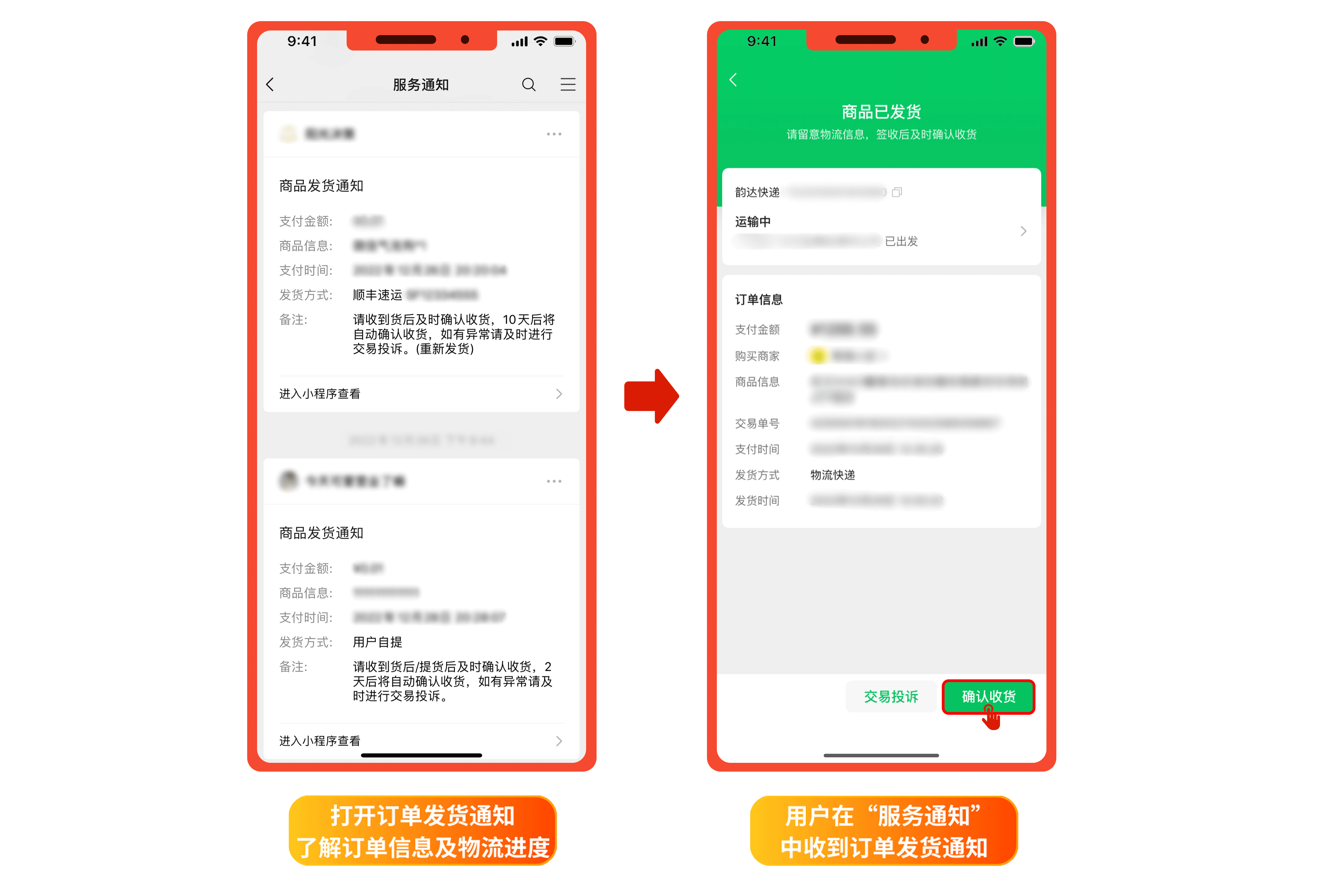 用户支付订单后,用户会在微信的【服务通知】中收到相应的「订单发货通知」,点击该通知后进入物流进度信息详情页,用户也可在该页面进行确认收货,订单资金在用户确认收货或系统自动确认收货后进行结算。